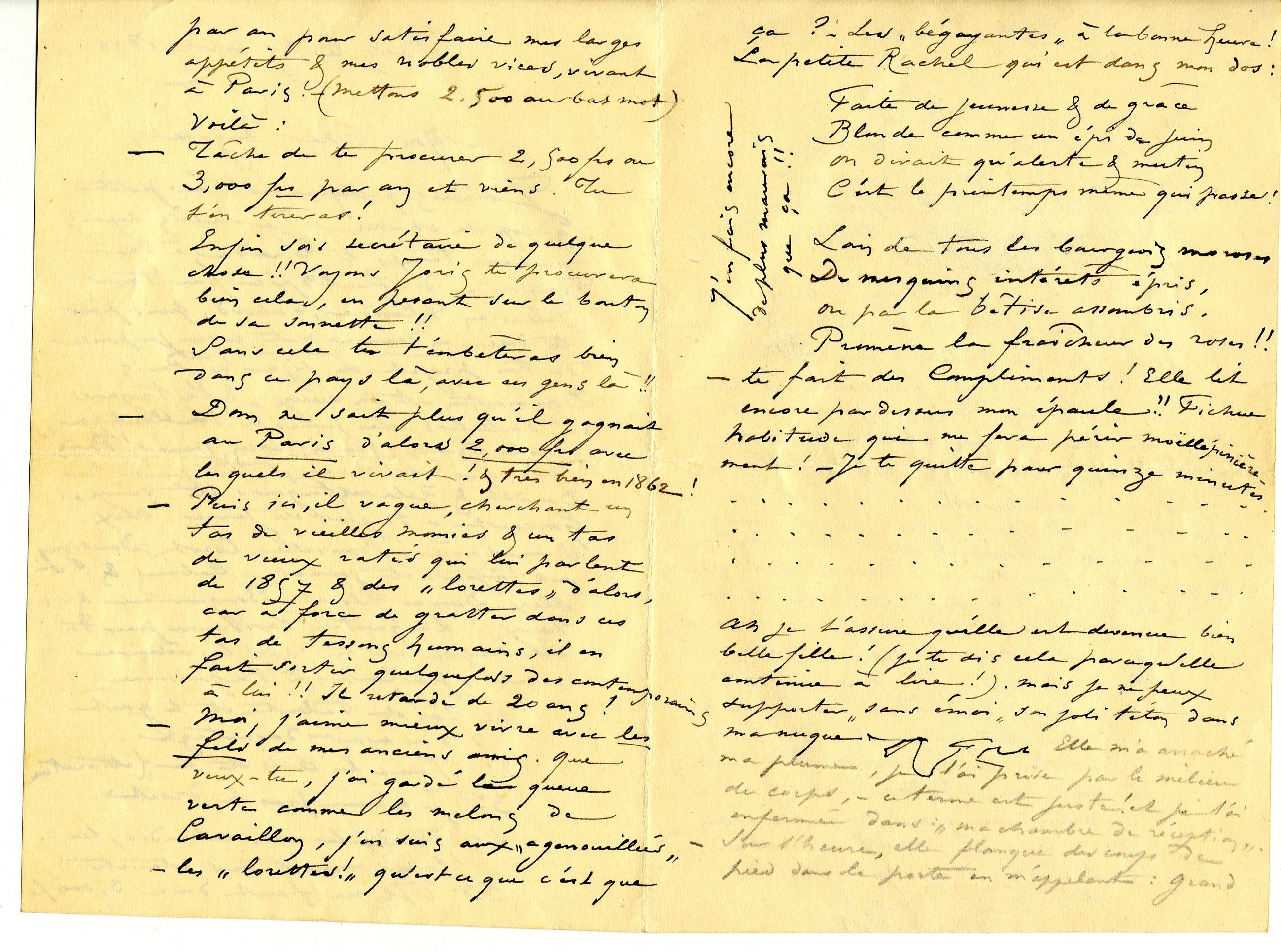 – Puis ici, il vague, cherchant un tas de vieilles momies & un tas de vieux ratés qui lui parlent de 1857 & des « lorettes » d’alors, car à force de gratter dans ces tas de tessons humains, il en fait sortir quelquefois des contemporains à lui !! Il retarde de 20 ans !