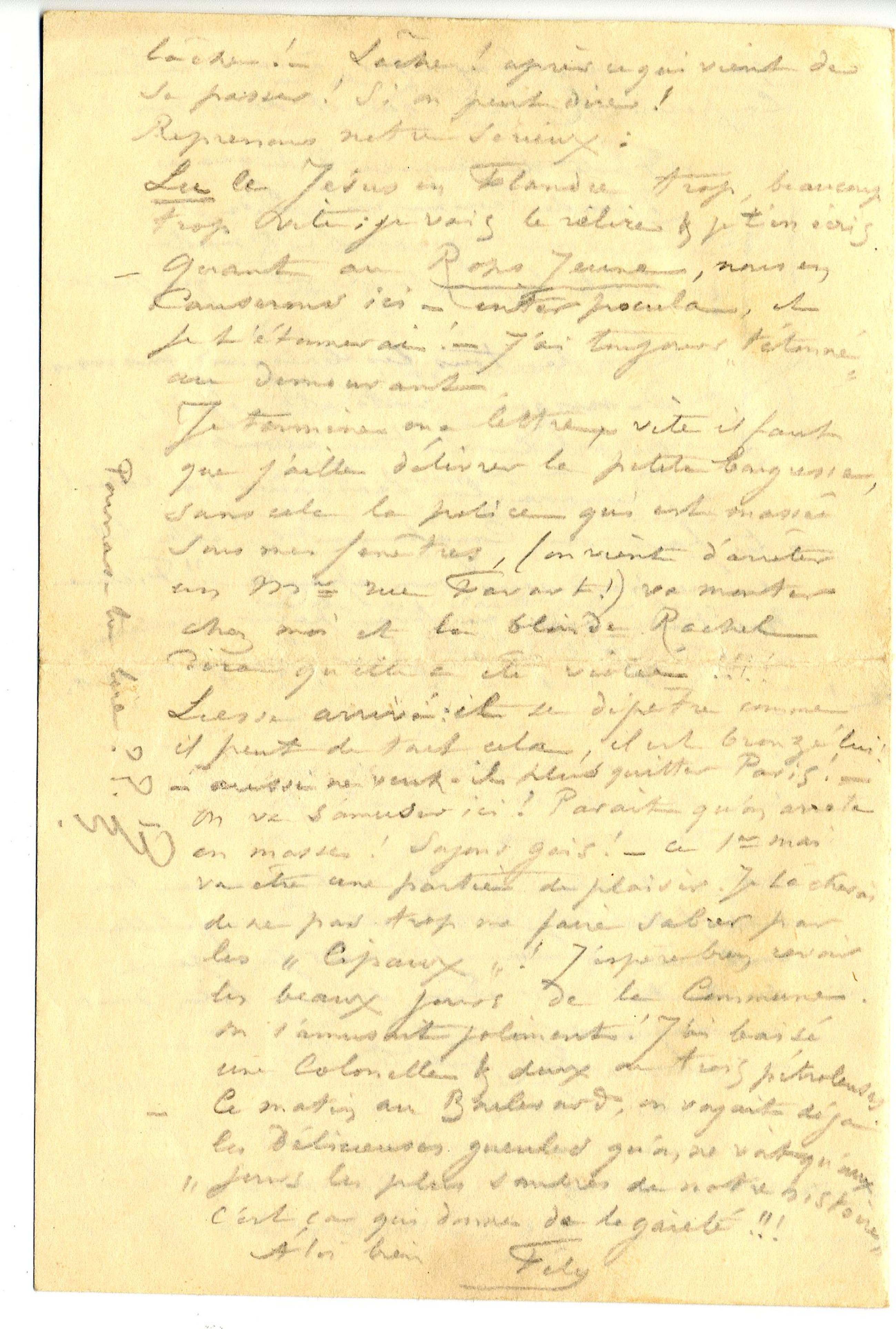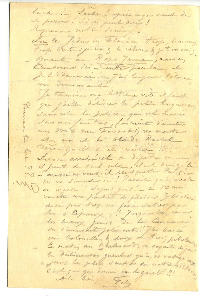 Liesse arrivé : il se dépêtre comme il peut de tout cela, il est bronzé lui ! – aussi ne veut-il plus quitter Paris ! – on va s’amuser ici ! Parait qu’on arrête en masse ! Soyons gais ! – ce 1er mai va être une partie de plaisir. Je tâcherai de ne pas trop me faire sabrer par les « Cipaux » ! J’espère bien revoir les beaux jours de la Commune. On s’amusait joliment ! J’ai baisé une Colonelle & deux ou trois pétroleuses.