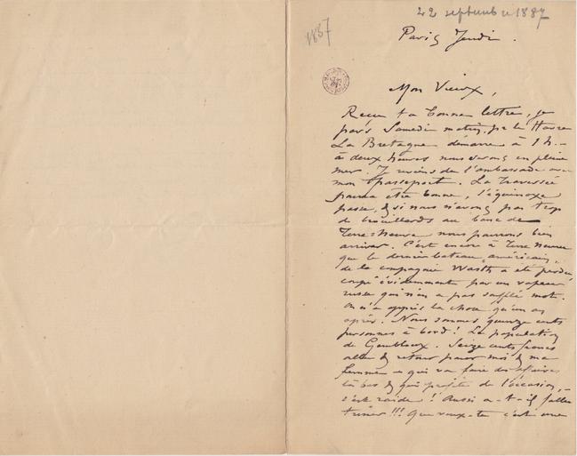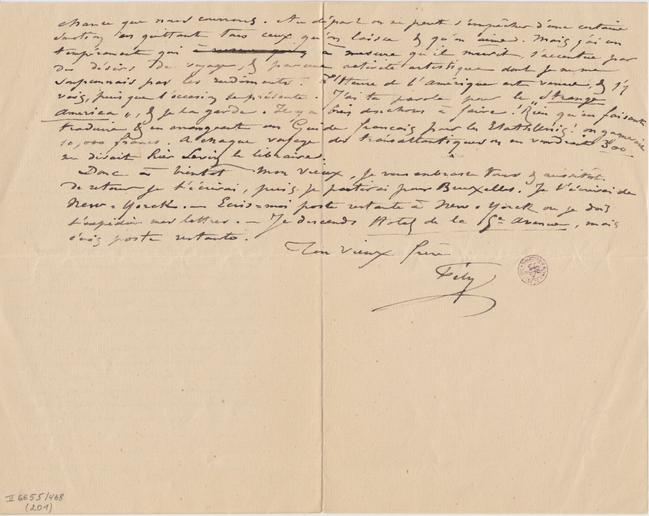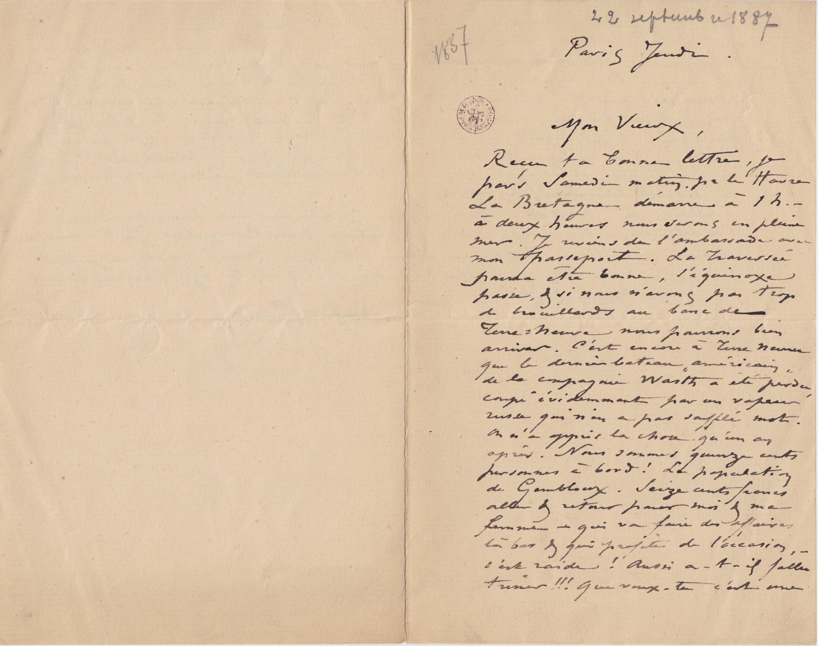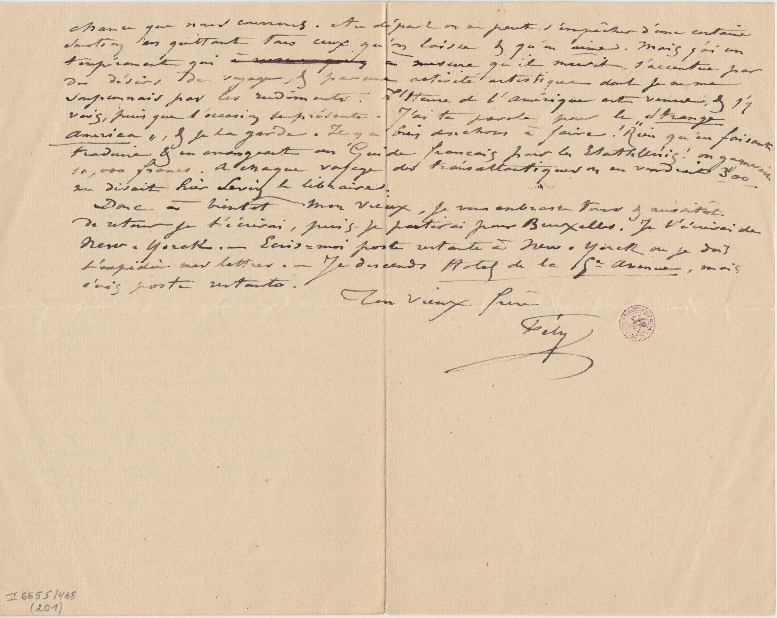 Donc à bientôt mon vieux, je vous embrasse tous & aussitôt de retour je t’écrirai, puis je partirai pour Bruxelles. Je t’écrirai de New-Yorck. – Écris-moi poste restante à New-Yorck où je dois t’expédier mes lettres. Je descends Hôtel de la 5e Avenue, mais écris poste restante.