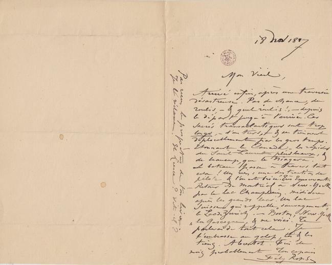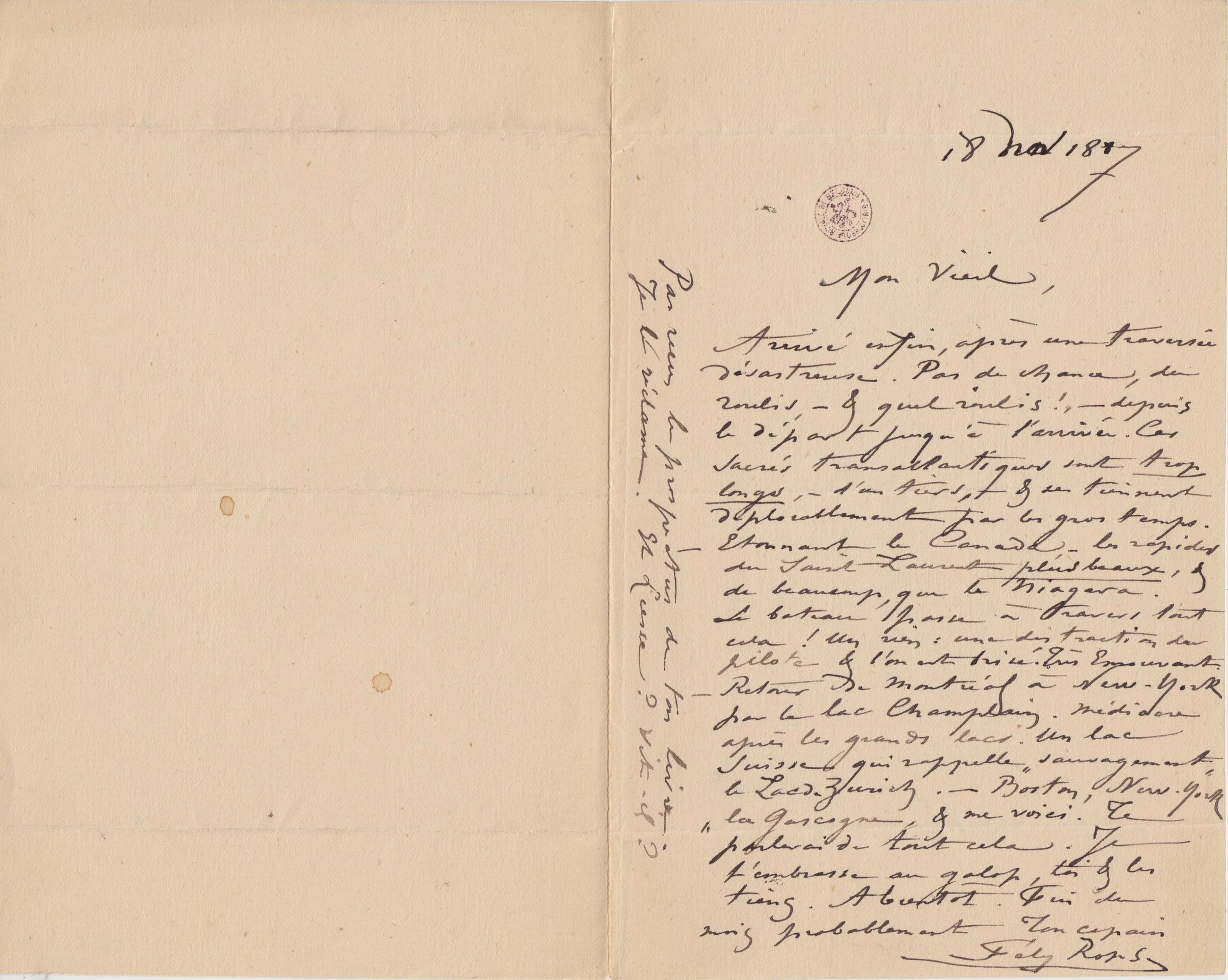 Arrivé enfin, après une traversée désastreuse. Pas de chance, du roulis, – & quel roulis !, – depuis le départ jusqu’à l’arrivée. Ces sacrés transatlantiques sont trop longs, – d’un tiers, – & se tiennent déplorablement par les gros temps.