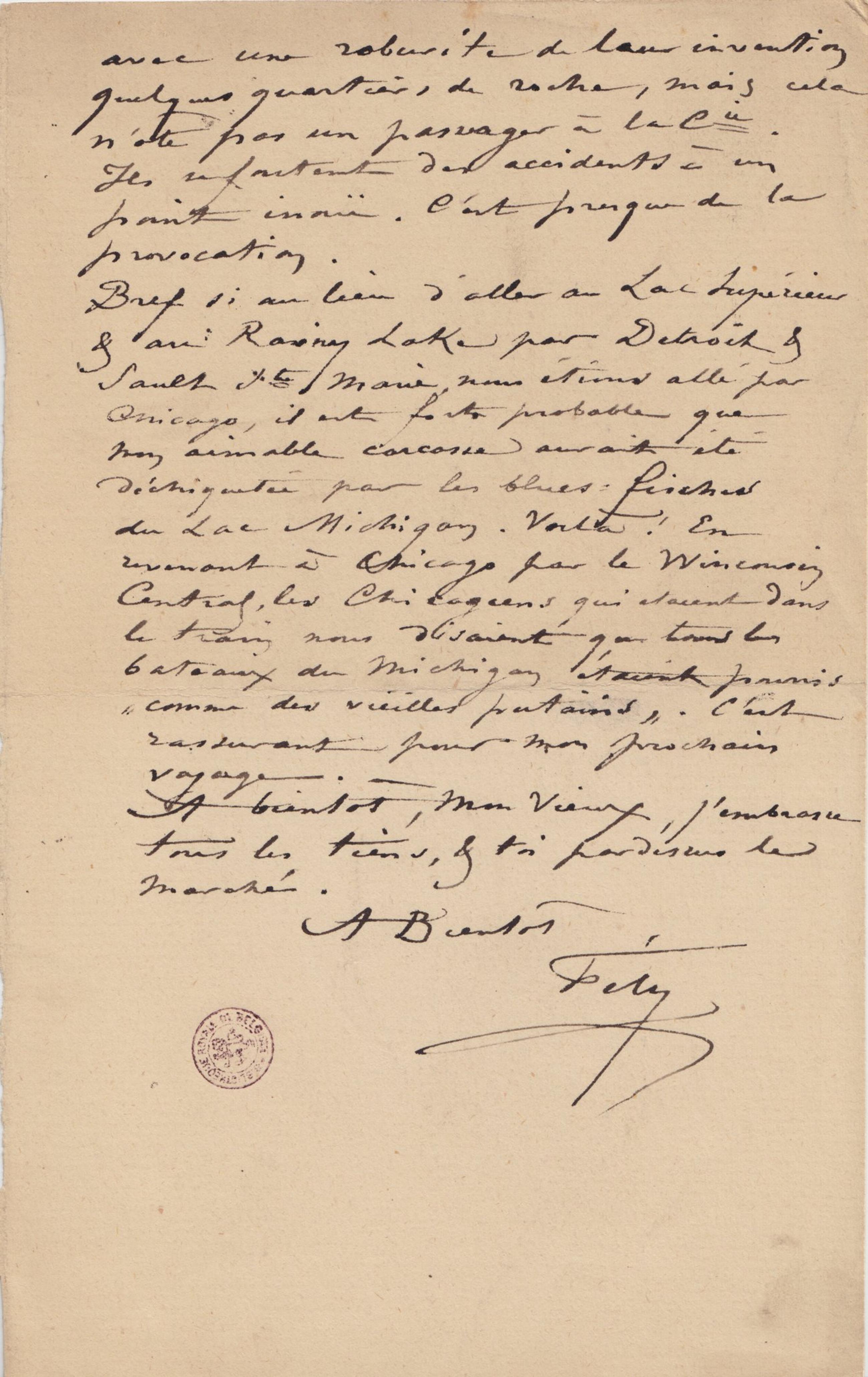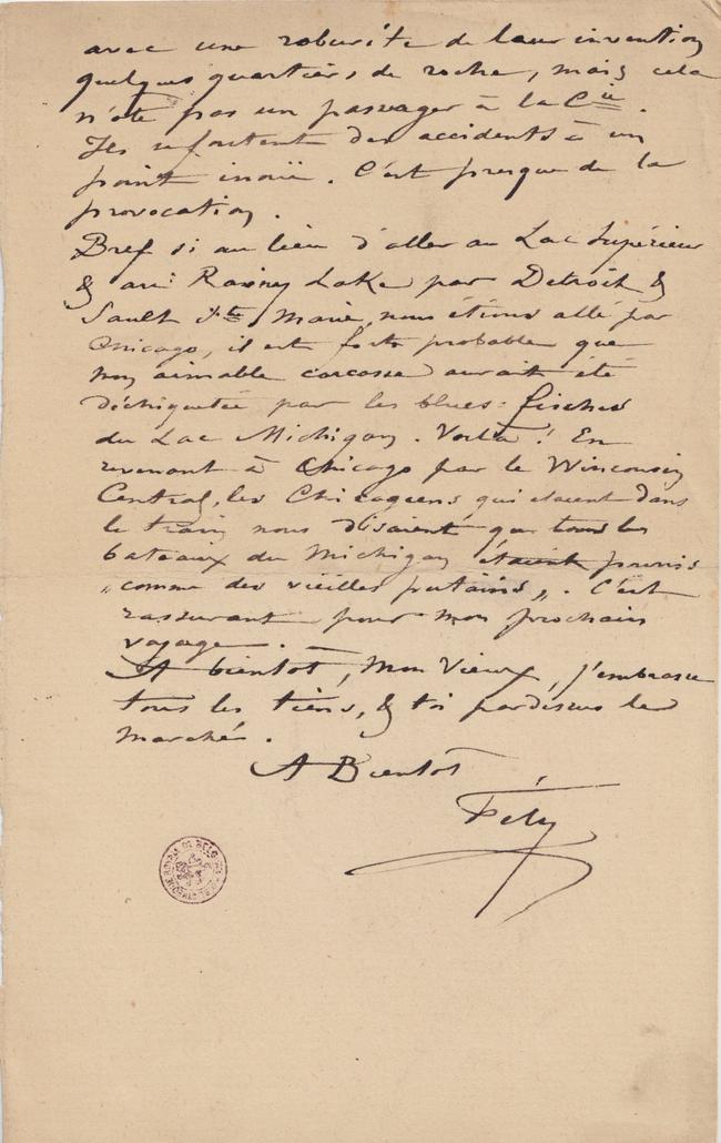 À propos tu aurais deviné juste ! Si nous n’avions pas, & sur mes instances, sur ma « science géographie » (!!!!) modifié notre route, nous prenions le Mercredi le « vernon » à Millwaukee & nous coulions ! Cela n’avait pas grande importance pour l’Amérique, mais cela en avait une excessive pour moi. La bàs, il faut s’attendre à cela. Tous les ans un des bateaux qui font le service de Montréal, se brise dans les Rapides. Cela n’empêche rien. Quand cela arrive, on fait sauter