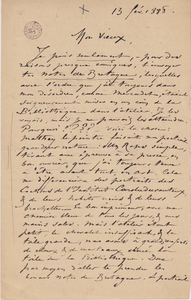 Je puis seulement, – pour des raisons presque comiques, t’envoyer tes notes de Bretagne, lesquelles avec l’ordre que j’ai toujours dans mon désordre, comme Mercadet, étaient soigneusement mises en un coin de la Bibliothèque dans l’atelier. Je les voyais, mais je ne pouvais les atteindre. Pourquoi ???? – Voici la chose : Mathey le peintre faisait mon portrait grandeur nature : Un Rops simple, tirant une épreuve à sa presse, en bon « ouvrier » que j’ai toujours tenu à être avant tout, en Art. Cela me differenciera des portraits des Cochons de l’Institut Caroluduranteux, & de leurs habits noirs & de leurs brochettes. – En bon imprimeur, avec ma chemise bleue de tous les jours, & mes mains sales. Mais l’atelier étant petit, le chevalet insuffisant, & la toile grande, nous avons à grands renforts de cloux & de marteaux cloué la toile sur la Bibliothèque. Donc pas moyen d’aller te prendre les bonnes notes de Bretagne. Le portrait