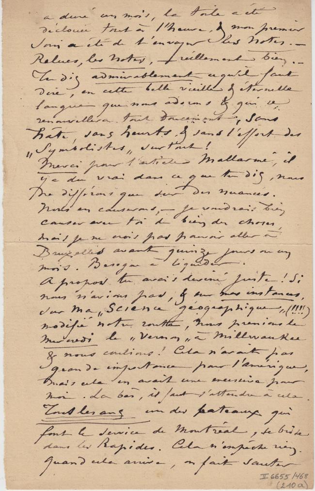 Merci pour l’articleMallarmé, il y a du vrai dans ce que tu dis, nous ne différons que sur des nuances. Nous en causerons, – je voudrais bien causer avec toi de bien des choses, mais je ne crois pas pouvoir aller à Bruxelles avant quinze jours ou un mois. Besogne à liquider.