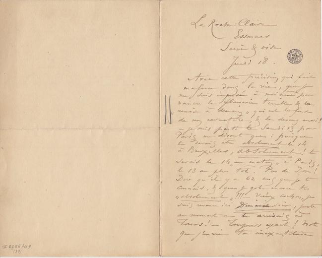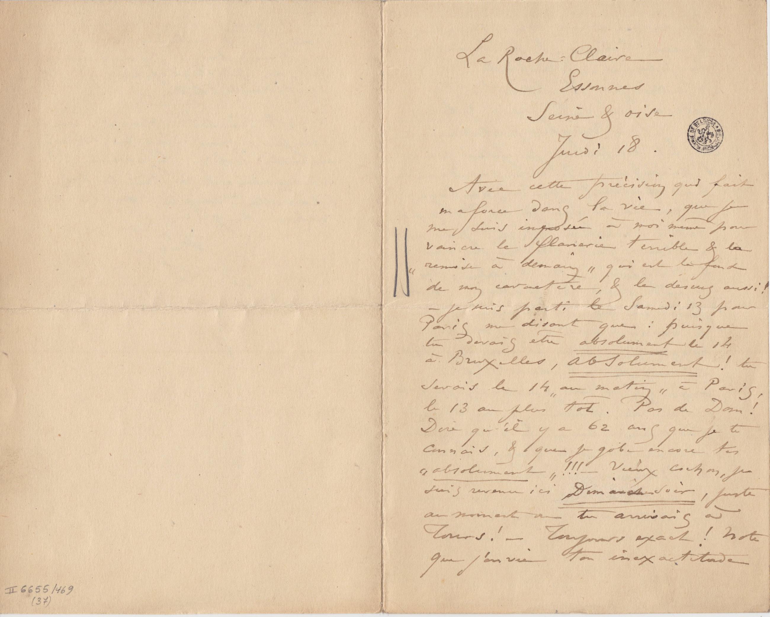 Avec cette précision qui fait ma force dans la vie, que je me suis imposée à moi même pour vaincre la flanerie terrible & la « remise à demain » qui est le fond de mon caractère, & le dessus aussi ! – je suis parti le Samedi 13 pour Paris me disant que : puisque tu devais être absolument le 14 à Bruxelles, absolument ! tu serais le 14 « au matin » à Paris, le 13 au plus tôt. Pas de Dom ! Dire qu’il y a 62 ans que je te connais, & que je gobe encore tes « absolument » !!! – Vieux cochon, je suis revenu ici, Dimanche soir, juste au moment où tu arrivais à Tours ! – Toujours exact ! Note que j’envie ton inexactitude