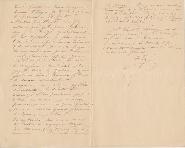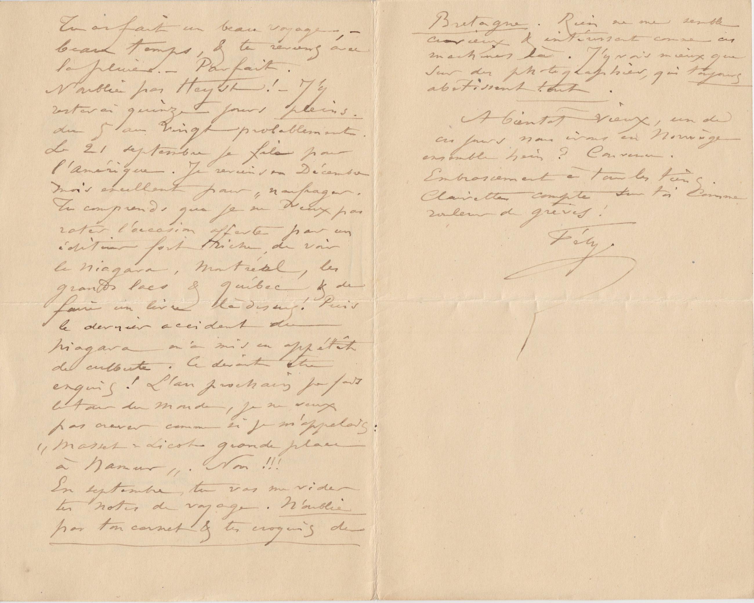 N’oublie pas Heyst ! – J’y resterai quinze jours pleins. du 5 au vingt probablement. Le 21 septembre je file pour l’Amérique. Je reviens en Décembre mois excellent pour « naufrager. Tu comprends que je ne veux pas rater l’occasion offerte par un éditeur fort riche, de voir le Niagara, Montréal, les grands lacs & Québec & de faire un livre là dessus ! Puis le dernier accident du Niagara m’a mis en appétit de culbute. Ce devait être exquis ! L’an prochain je fais le tour du monde, je ne veux pas crever comme si je m’appelais : « Masset-Licot grande place à Namur ». Non !!!