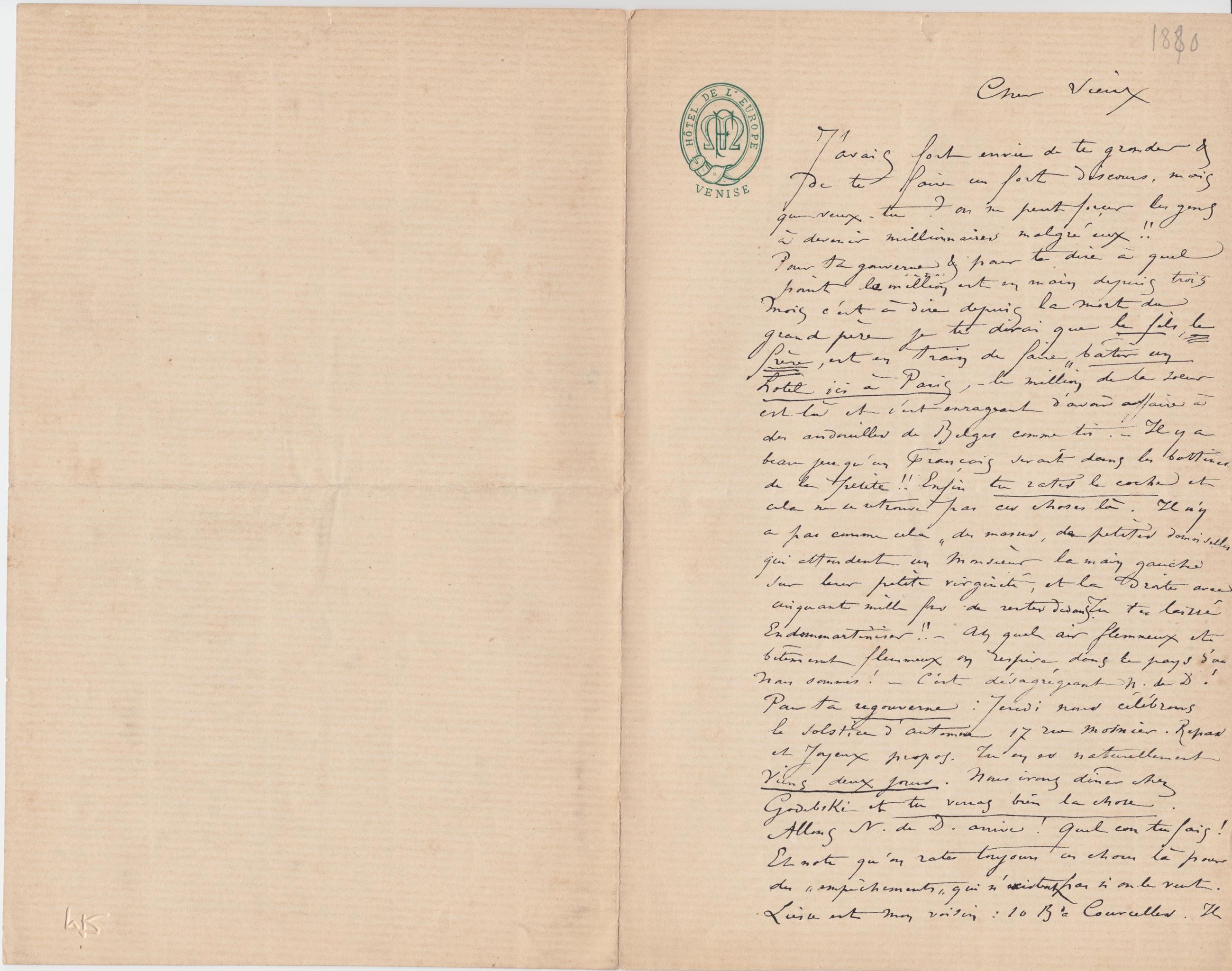 Écrite en Plume Noir. En-tête: HOTEL DE L'EUROPE - VENISE.