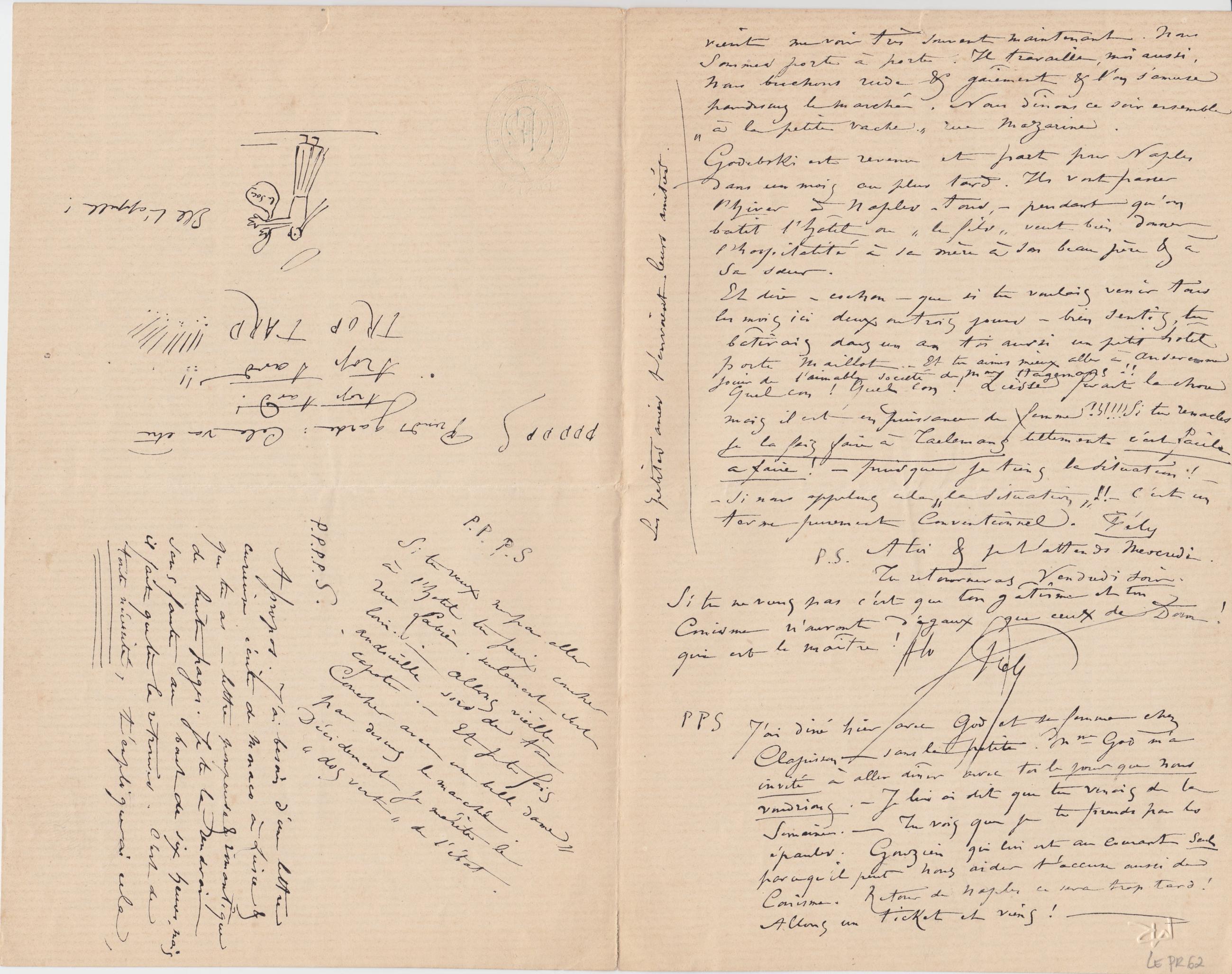 PPS J’ai diné hier avec God et sa femme chez Clapisson – sans la petite. Mme God m’a invité à aller dîner avec toi le jour que nous voudrions. – Je lui ai dit que tu venais de la Semaine. – Tu vois que je te prends par les épaules. Gouzien qui lui est au courant seul parce qu’il peut nous aider t’accuse aussi de Conisme. Retour de Naples ce sera trop tard ! Allons un ticket et viens ! –