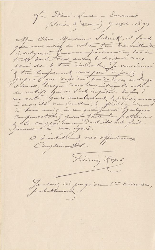 il faut que vous usiez de votre très bienveillante indulgence pour me pardonner un tas de torts dont vous auriez le droit de vous plaindre & très vivement. Je vous écrirai & très longuement sous peu de jours & j’espère que vous me pardonnerez ces longs silences, lorsque vous connaîtrez la valeur des motifs qui me l’ont imposé. Enfin ! me voilà guéri moralement & physiquement à ce qu’il me semble, & prêt à donner à mes amis, à ce que je crois, quelques compensations pour toute la patience & la complaisance dont ils ont fait preuve à mon égard.