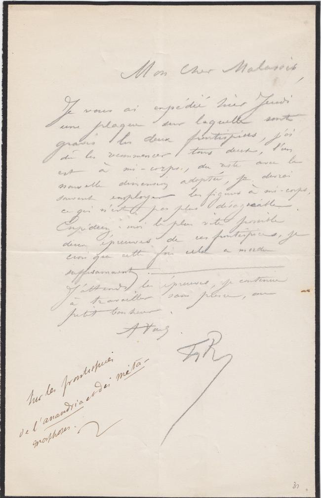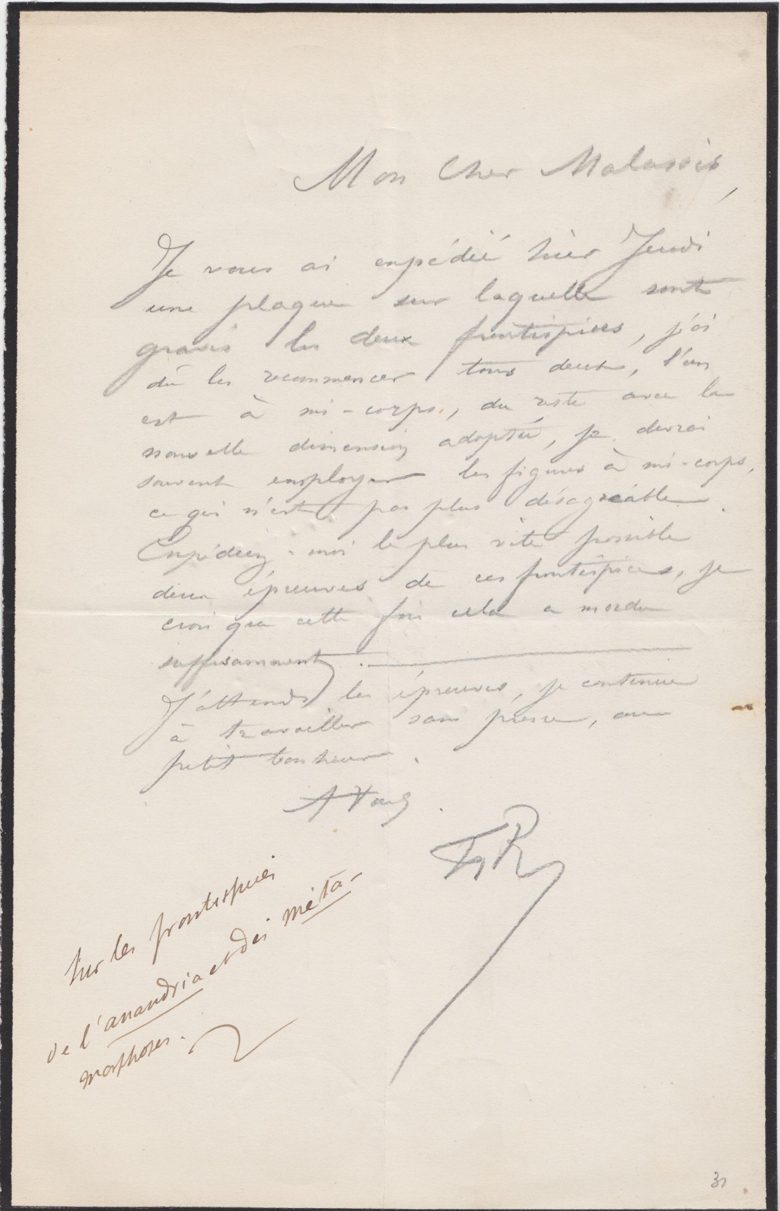 Je vous ai expédié hier Jeudi une plaque sur laquelle sont gravés les deux frontispices, j’ai dû les recommencer tous deux, l’un est à mi-corps, du reste avec la nouvelle dimension adoptée, je devrai souvent employer les figures à mi-corps, ce qui n’est pas plus désagréable. Expédiez-moi le plus vite possible deux épreuves de ces frontispices, je crois que cette fois cela a mordu suffisamment.–
