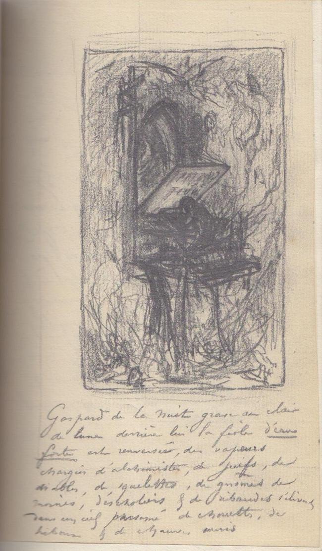 Gaspard de la nuit grave au clair de lune derrière lui la fiole d’eau forte est renversée, des vapeurs chargées d’alchimistes, de juifs, des diables, de squelettes, de gnômes de moines, d’escholiers & de ribaudes s’elèvent dans un ciel parsemé de chouettes, de hiboux & de chauves souris