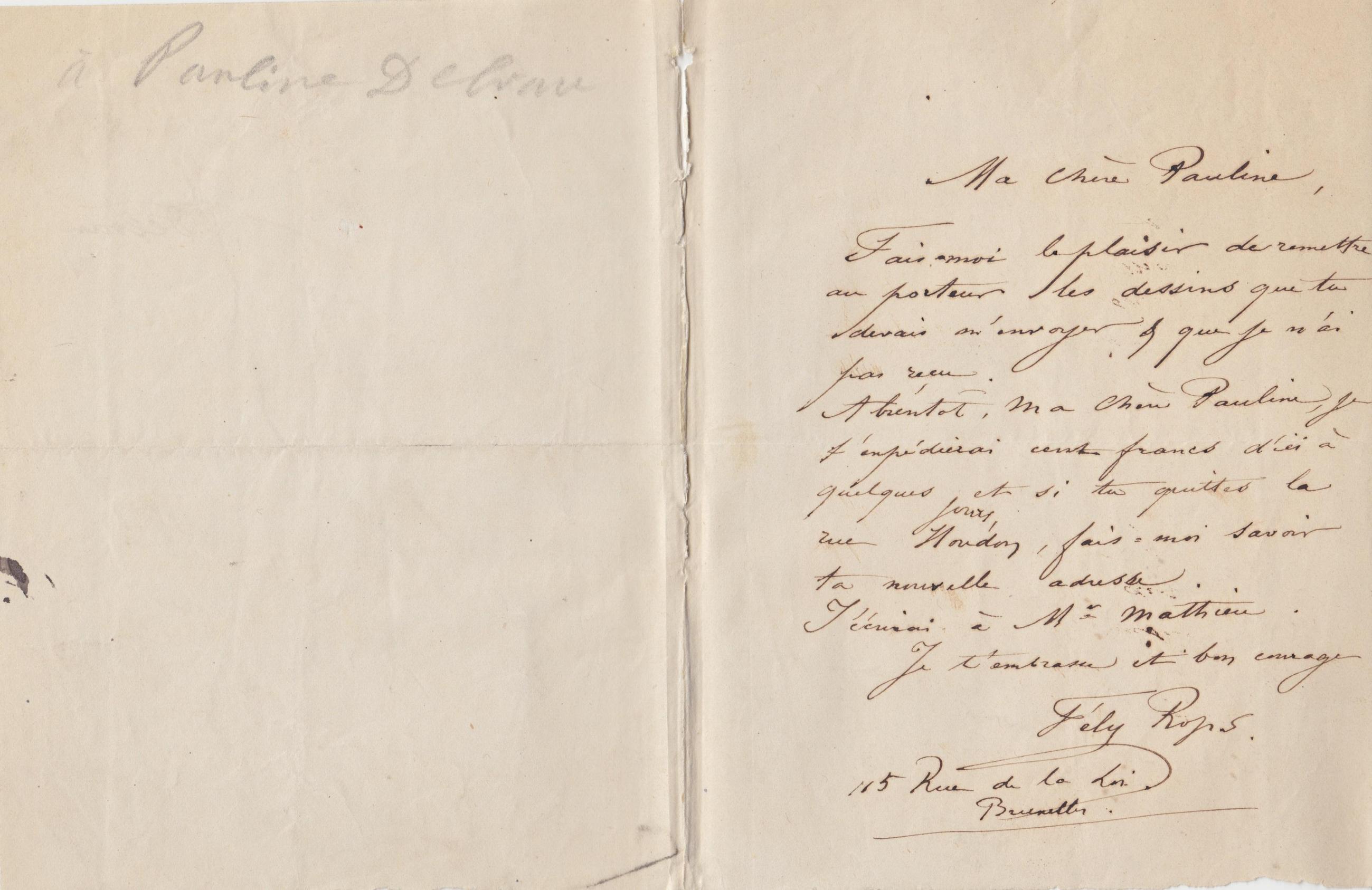 À bientôt, Ma Chère Pauline, je t’expédierai cent francs d’ici à quelques jours, et si tu quittes la rue Houdon, fais-moi savoir ta nouvelle adresse.