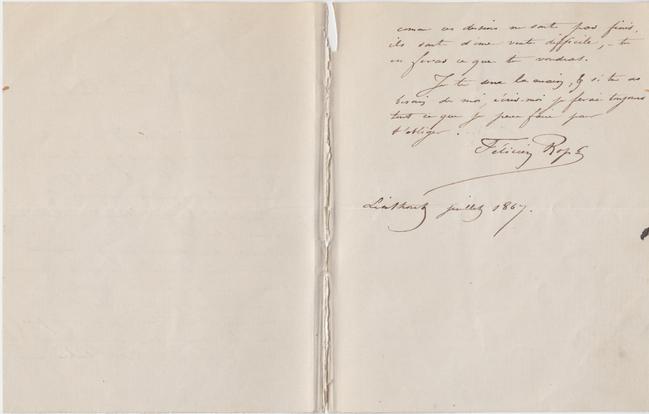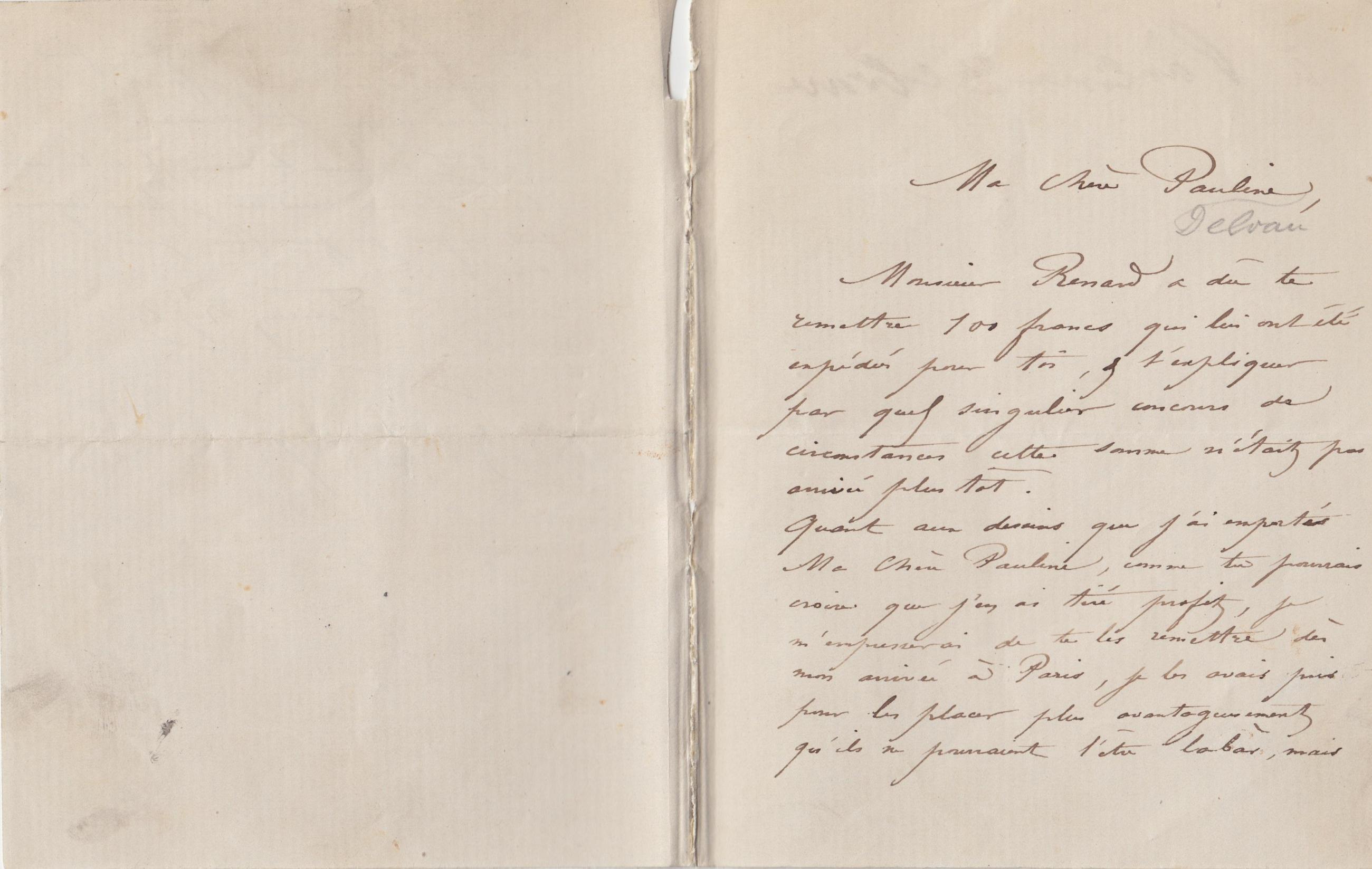 Quant aux dessins que j’ai emportés Ma Chère Pauline, comme tu pourrais croire que j’en ai tiré profit, je m’empresserai de te les remettre dès mon arrivée à Paris, je les avais pris pour les placer plus avantageusement qu’ils ne pourraient l’être la bàs, mais