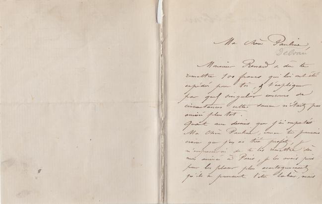 Monsieur Renard a dû te remettre 100 francs qui lui ont été expédiés pour toi, & t’expliquer par quel singulier concours de circonstances cette somme n’était pas arrivée plus tôt.
