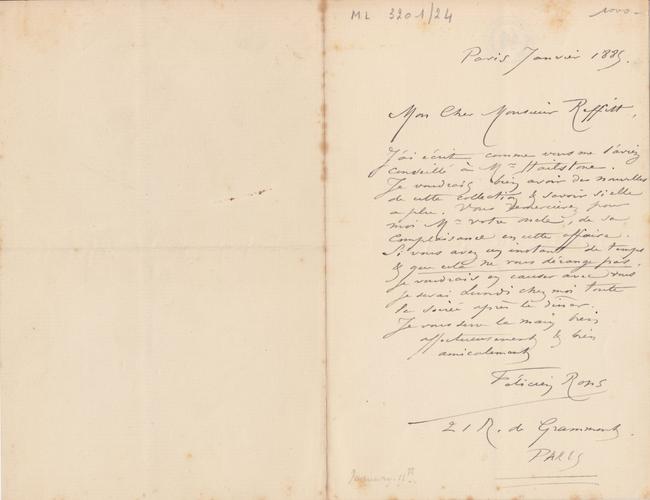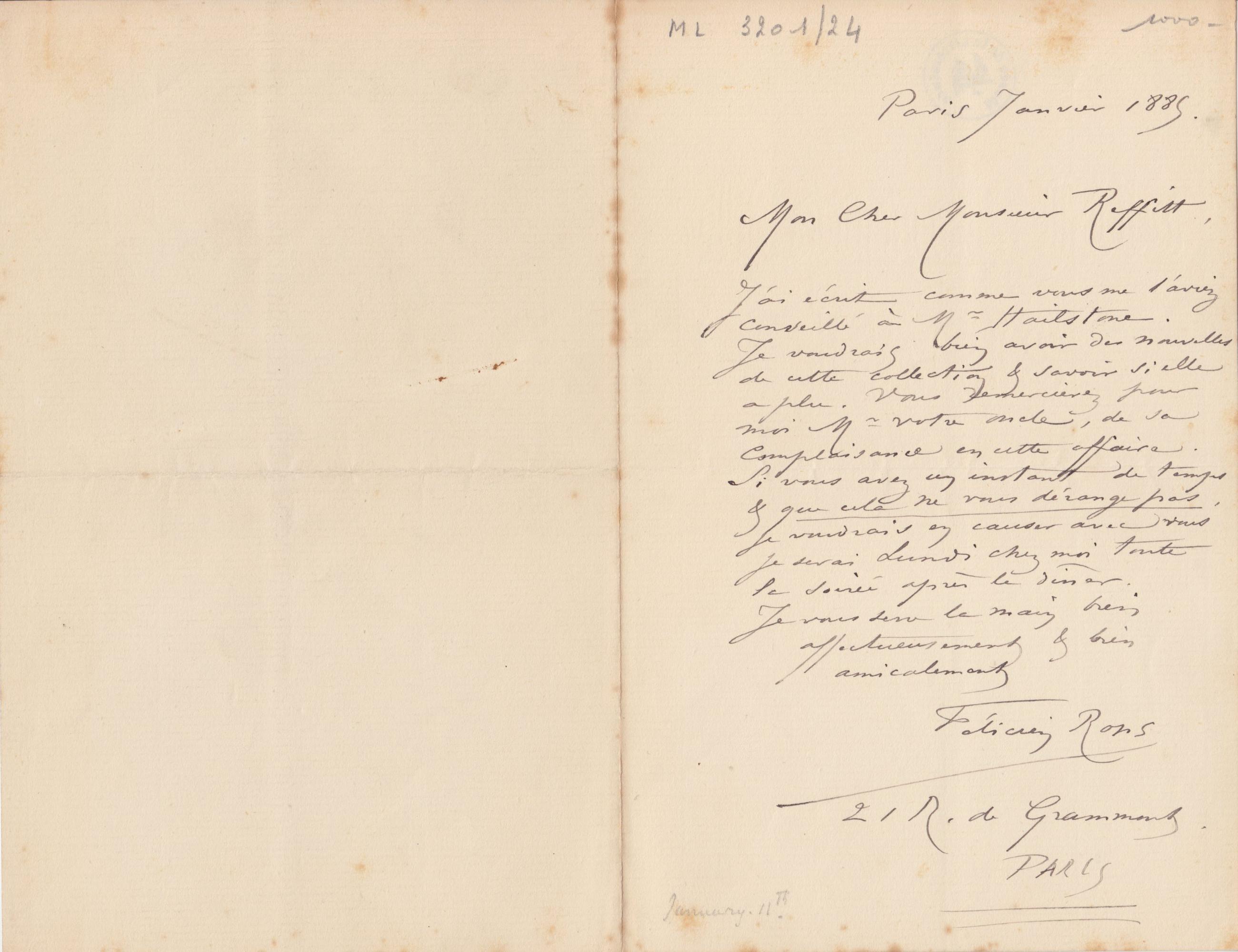 Je voudrais bien avoir des nouvelles de cette collection & savoir si elle a plu. Vous remercierez pour moi Mr votre oncle, de sa complaisance en cette affaire. Si vous avez un instant de temps & que cela ne vous dérange pas, je voudrais en causer avec vous je serai Lundi chez moi toute la soirée après le dîner.