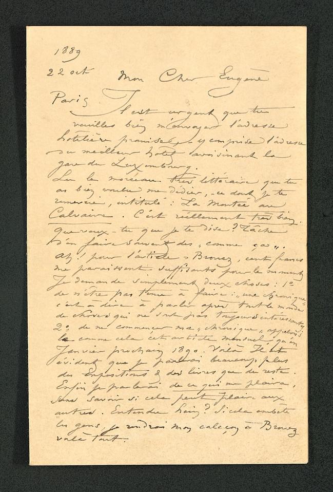 Lu le morceau très littéraire que tu as bien voulu me dédier, – ce dont je te remercie, intitulé : La Montée au Calvaire . C’est réellement très bien. Que veux-tu que je te dise ? Tâche d’en faire souvent des « comme ça ». Ah ! pour l’article-