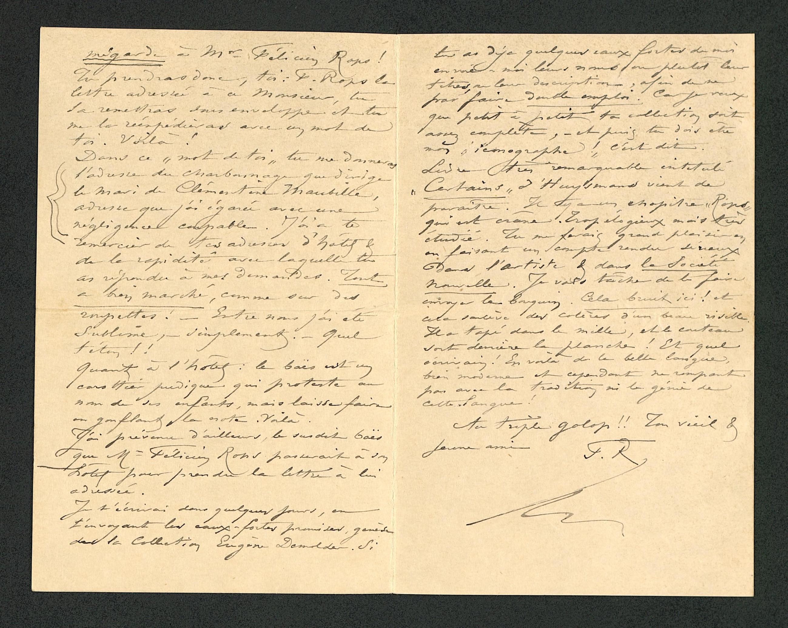 Lis ce très remarquable intitulé « Certains » d’Huysmans vient de paraître. Il y a un chapitre « Rops » qui est crâne. Trop élogieux mais très étudié. Tu me ferais grand plaisir en en faisant un compte rendu sérieux dans l’Artiste & dans la Société Nouvelle. Je vais tâcher de te faire envoyer le bouquin. Cela bruit ici ! et cela soulève des colères d’un beau risible. Il a tapé dans le mille, et le couteau sort derrière la planche ! Et quel écrivain ! En voilà de la belle langue, bien moderne et cependant ne rompant pas avec la tradition ni le génie de cette langue !