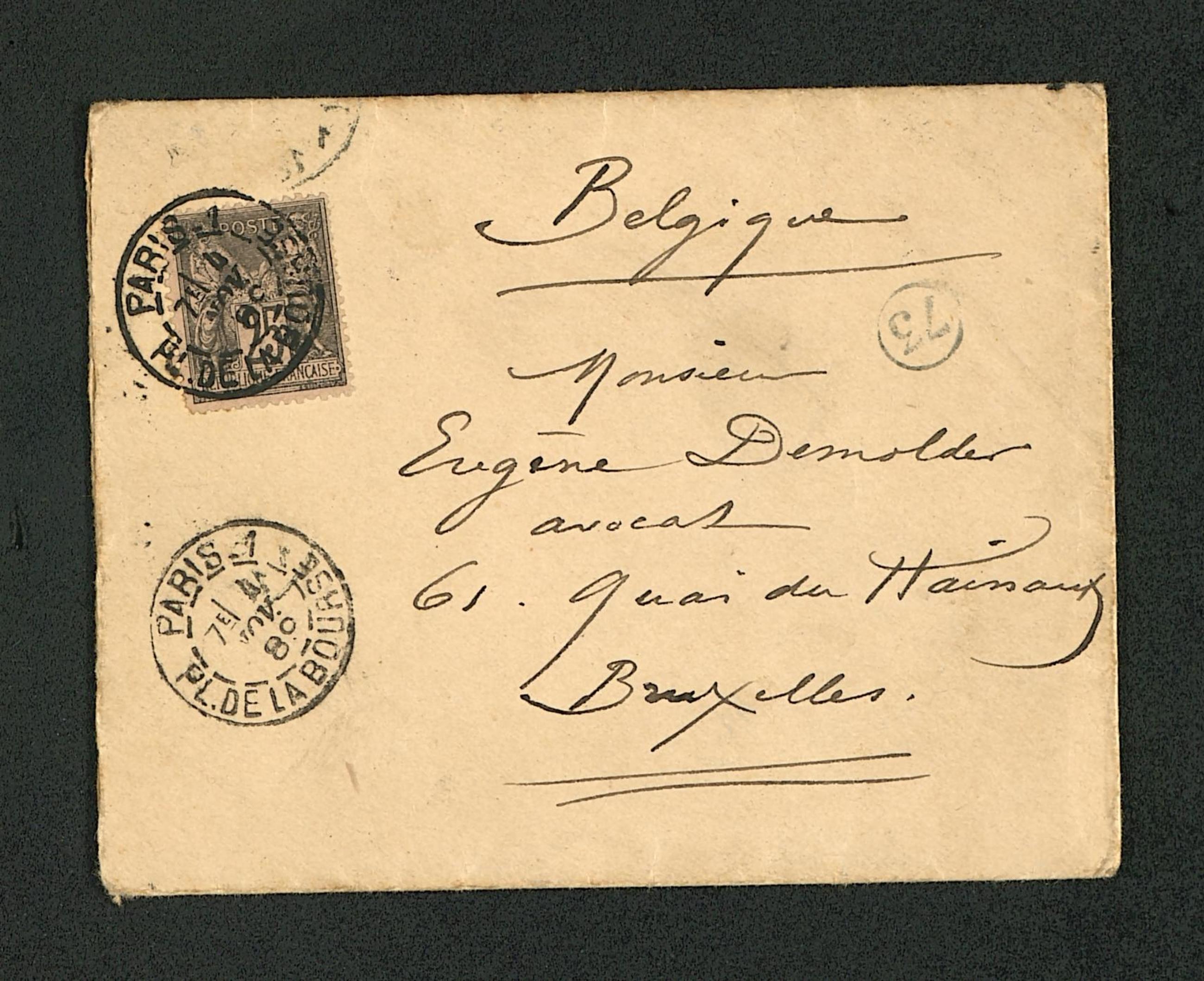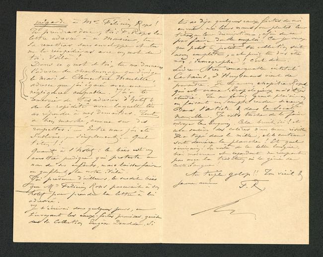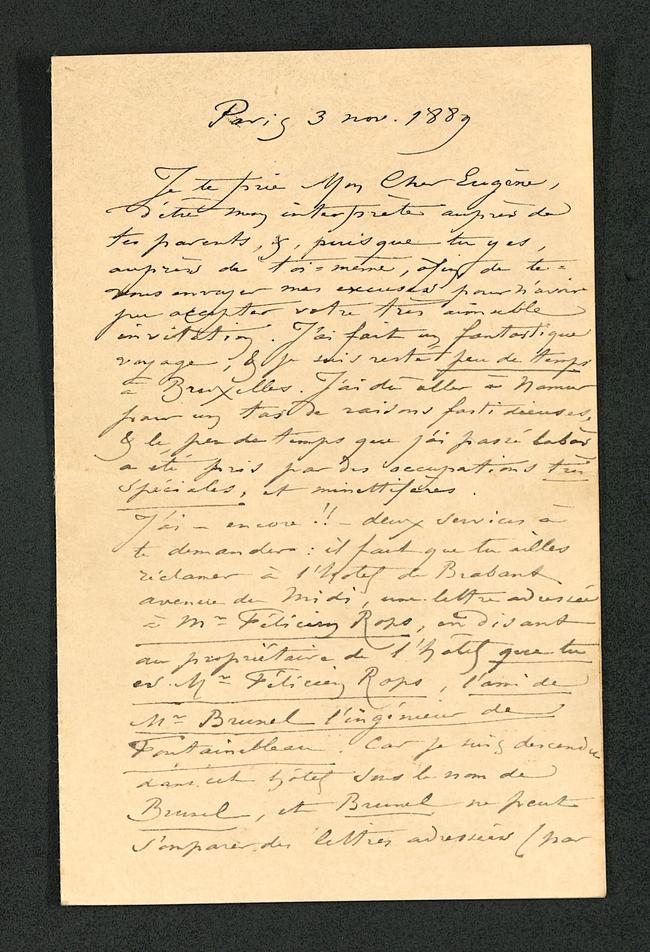 Je te prie Mon Cher Eugène, d’être mon interprète auprès de tes parents, &, puisque tu y es, auprès de toi-même, afin de te-vous envoyer mes excuses pour n’avoir pu accepter votre très aimable invitation. J’ai fait un fantastique voyage, & je suis resté peu de temps à Bruxelles. J’ai dû aller à Namur pour un tas de raisons fastidieuses, & le peu de temps que j’ai passé làbas a été pris par des occupations très spéciales, et rFélicien Rops, en disant au propriétaire de l’hôtel que tu es MrFélicien Rops, l’ami de MrBrunel l’ingénieur de Fontainebleau. Car je suis descendu dans cet hôtel sous le nom de Brunel, et Brunel ne peut s’emparer des lettres adressées (par