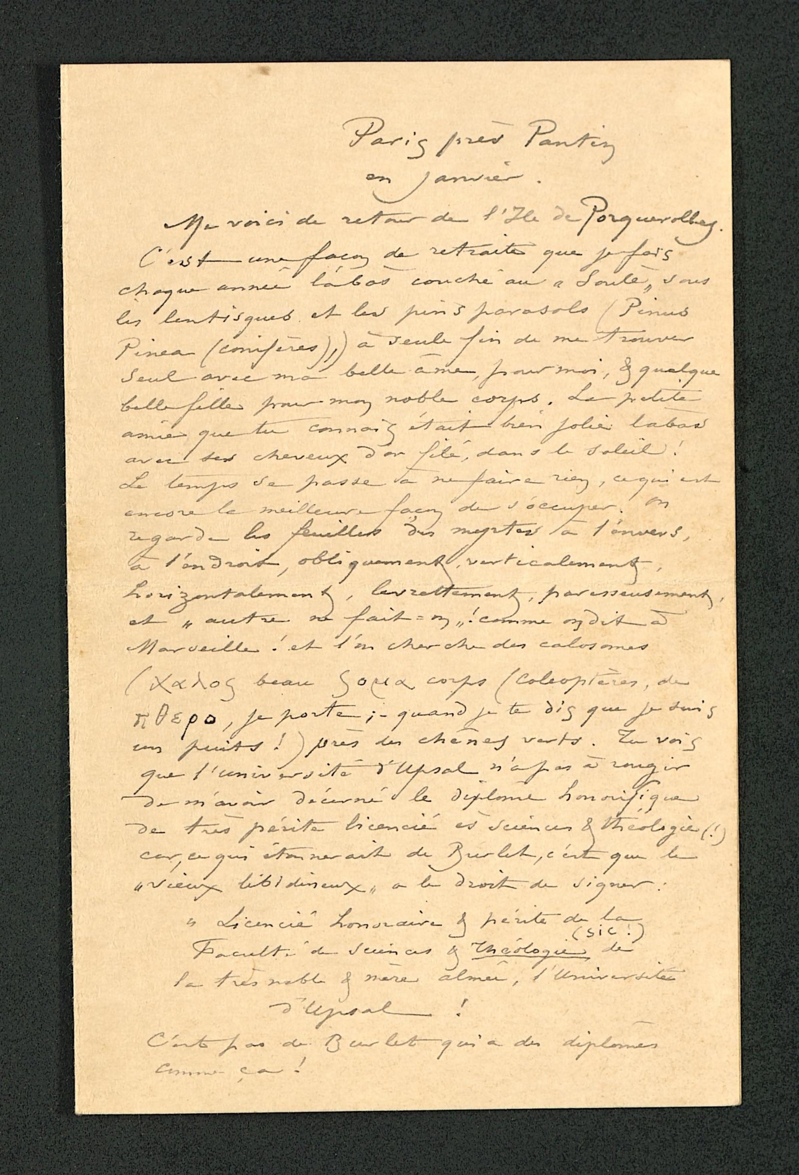 , je porte ; – quand je te dis que je suis un puits !) près des chênes verts. Tu vois que l’université d’Upsal n’a pas à rougir de m’avoir décerné le diplôme honorifique de très périte licencié ès sciences & théologie (!) car, ce qui étonnerait de Burlet, c’est que le « vieux libidineux » a le droit de signer :