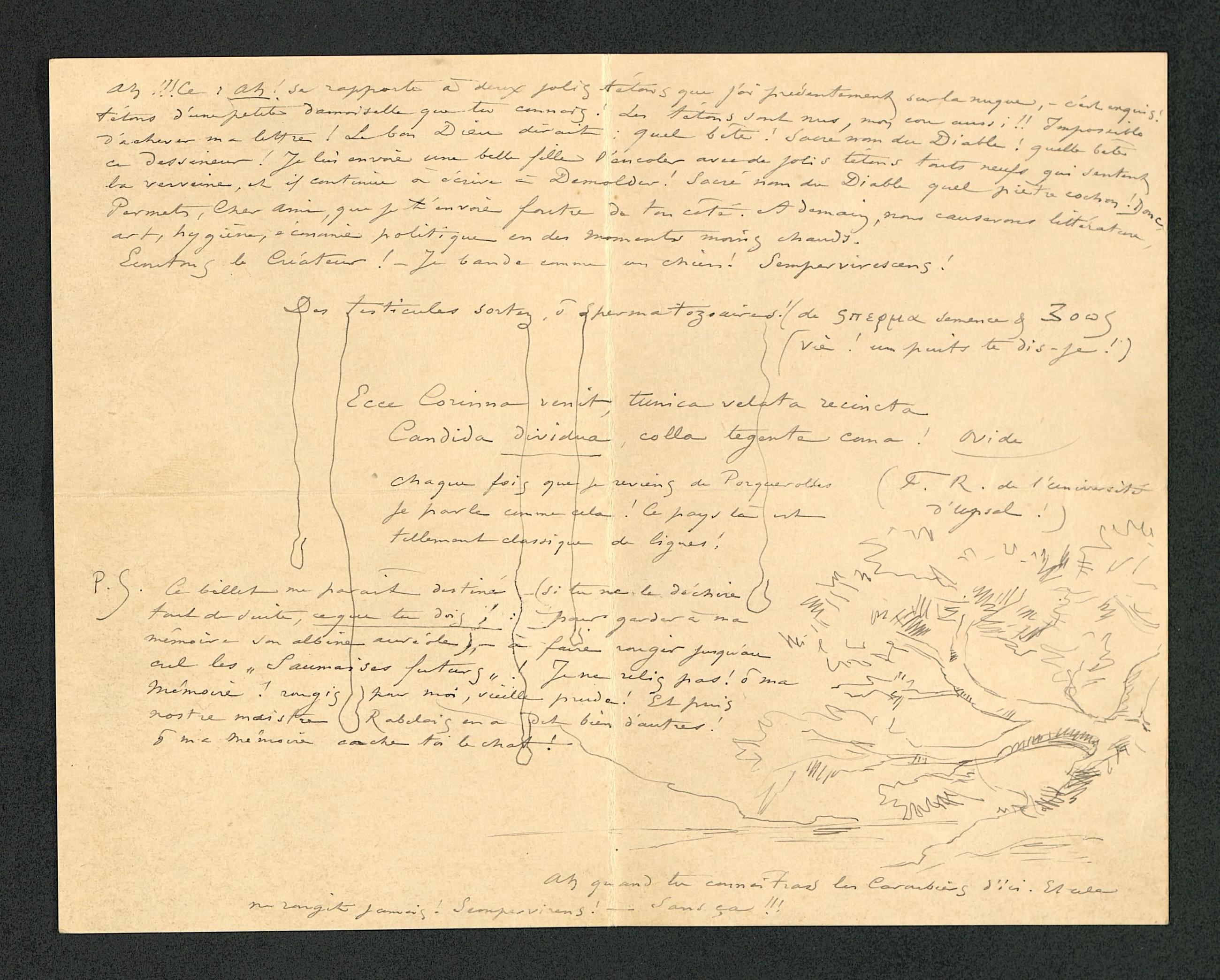 P.S. Ce billet me paraît destiné – (si tu ne le déchire tout de suite, ce que tu dois ! : pour garder à ma mémoire son albine auréole), – à faire rougir jusqu’au cul les « Saumaises futurs » ! Je ne relis pas ! ô ma mémoire ! rougis pour moi, vieille prude ! Et puis nostre maistre Rabelais en a dit bien d’autres ! ô ma mémoire cache toi le chat !
