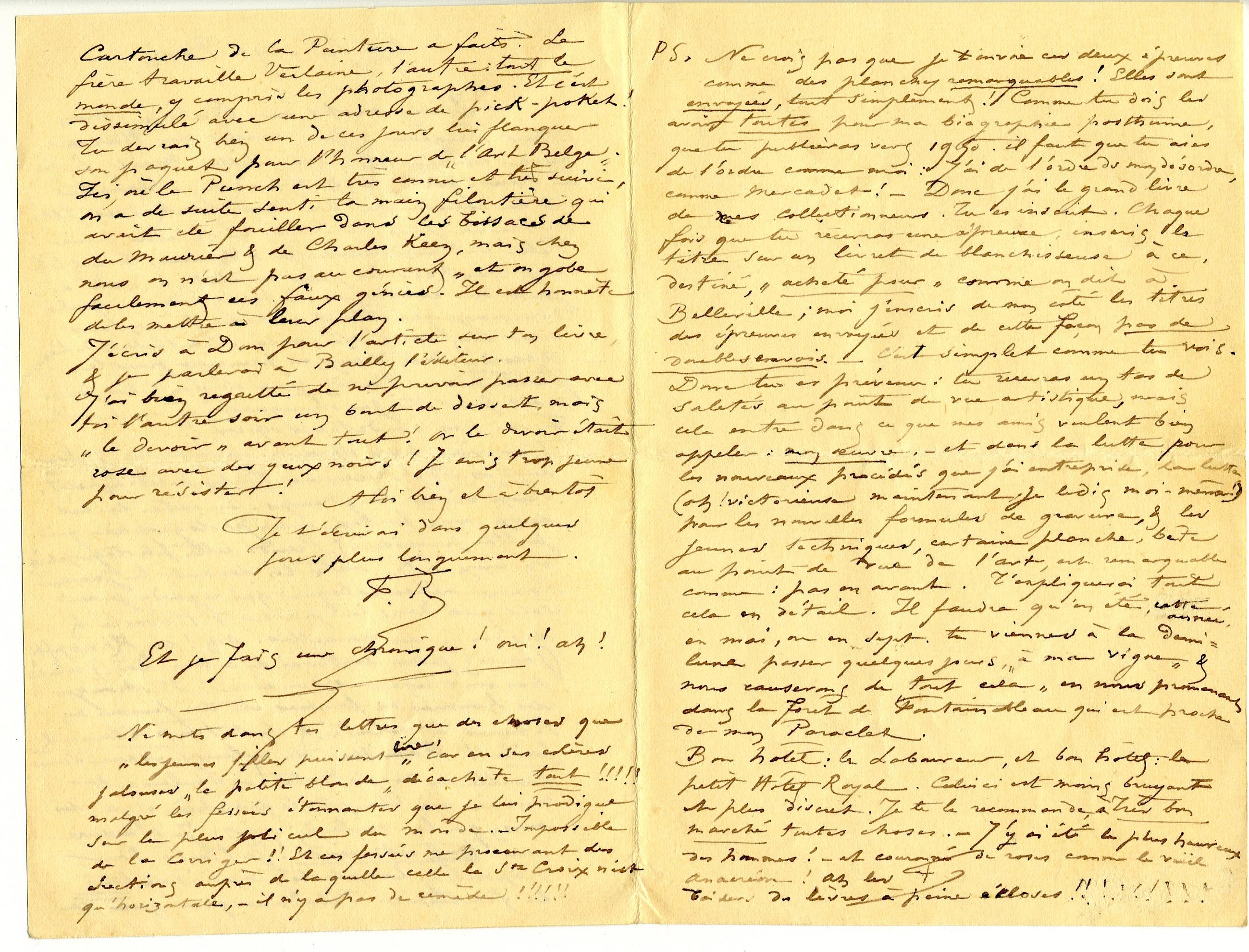 PS, Ne crois pas que je t’envoie ces deux épreuves comme des planches remarquables ! Elles sont envoyées, tout simplement ! Comme tu dois les avoir toutes pour ma biographie posthume, que tu publieras vers 1950. il faut que tu aies de l’ordre comme moi : J’ai de l’ordre dans mon désordre, comme Mercadet ! – Donc j’ai le grand livre de mes collectionneurs. Tu es inscrit. Chaque fois que tu recevras une épreuve, inscris le titre sur un livret de blanchisseuse à ce, destiné, « acheté pour » comme on dit à Belleville ; moi j’inscris de mon côté les titres des épreuves envoyées et de cette façon pas de doubles envois. – C’est simplet comme tu vois. Donc tu es prévenu : tu recevras un tas de saletés au point de vue artistique, mais cela entre dans ce que mes amis veulent bien appeler : mon œuvre. – et dans la lutte pour les nouveaux procédés que j’ai entreprise, la lutte (oh ! victorieuse maintenant, je le dis moi-même !) pour les nouvelles formules de gravure, & les jeunes techniques, certaine planche, bête au point de vue de l’art, est remarquable comme : pas en avant. T’expliquerai tout cela en détail. Il faudra qu’en été, cette année, en mai, ou en sept. tu viennes à la demi-lune passer quelques jours, « à ma vigne » & nous causerons de tout cela » en nous promenant dans la forêt de Fontainebleau qui est proche de mon Paraclet.