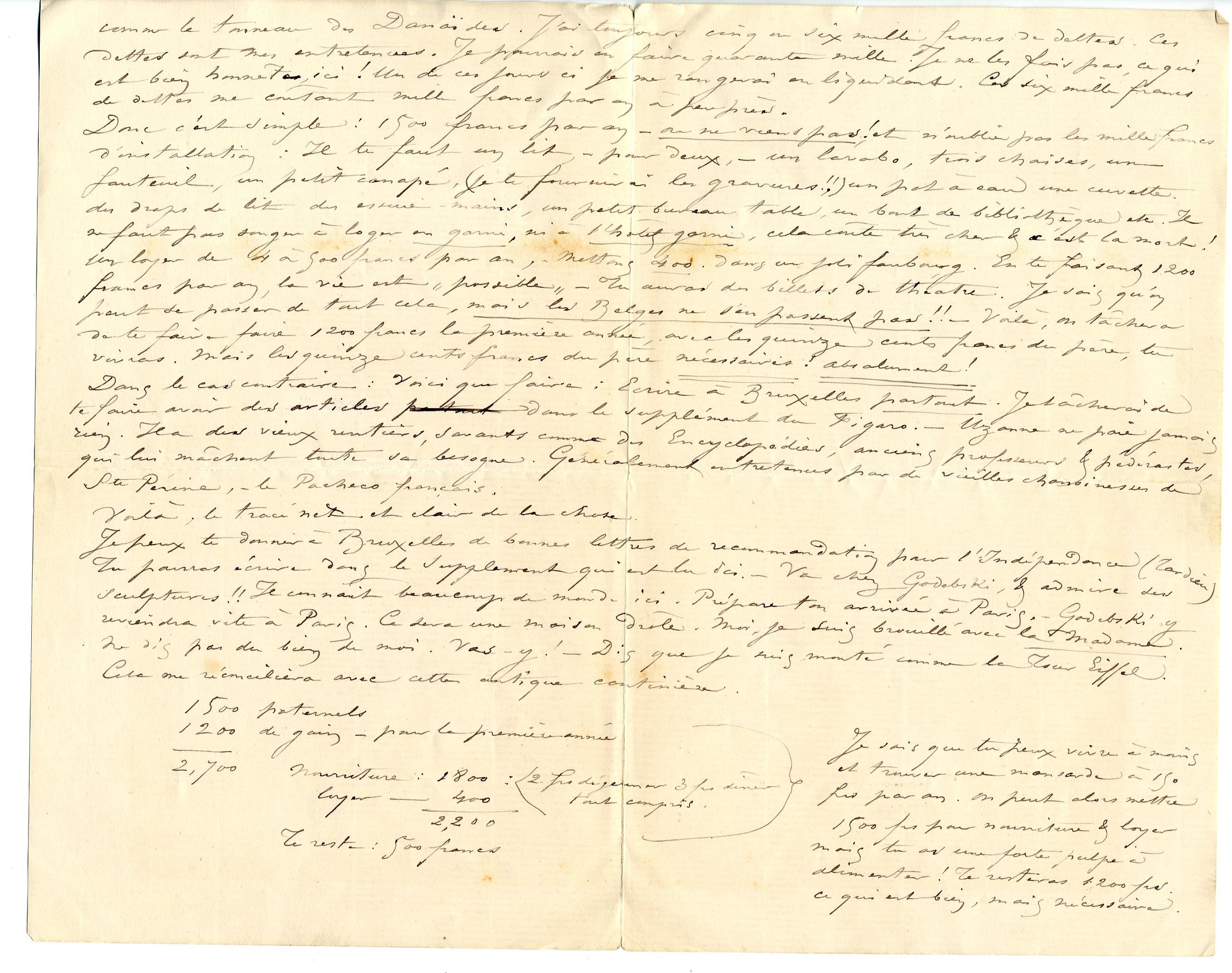 Donc c’est simple : 1500 francs par an – ou ne viens pas ! et n’oublie pas les mille francs d’installation : Il te faut un lit, – pour deux, – un lavabo, trois chaises, un fauteuil, un petit canapé, (je te fournirai les gravures !!) un pot à eau une cuvette. des draps de lit des essuie-mains, un petit bureau table, un bout de bibliothèque etc. Il ne faut pas songer à loger en garni, ni à l’hôtel garni, cela coûte très cher & c’est la mort ! Un loyer de 4 à 500 francs par an, mettons, – 400. dans un joli faubourg. En te faisant 1200 francs par an, la vie est « possible » – Tu auras des billets de théatre. Je sais qu’on peut se passer de tout cela, mais les Belges ne s’en passent pas !! – Voilà, on tâchera de te faire faire 1200 francs la première année, avec les quinze cents francs du père, tu vivras. Mais les quinze cents francs du père nécessaires ! absolument !