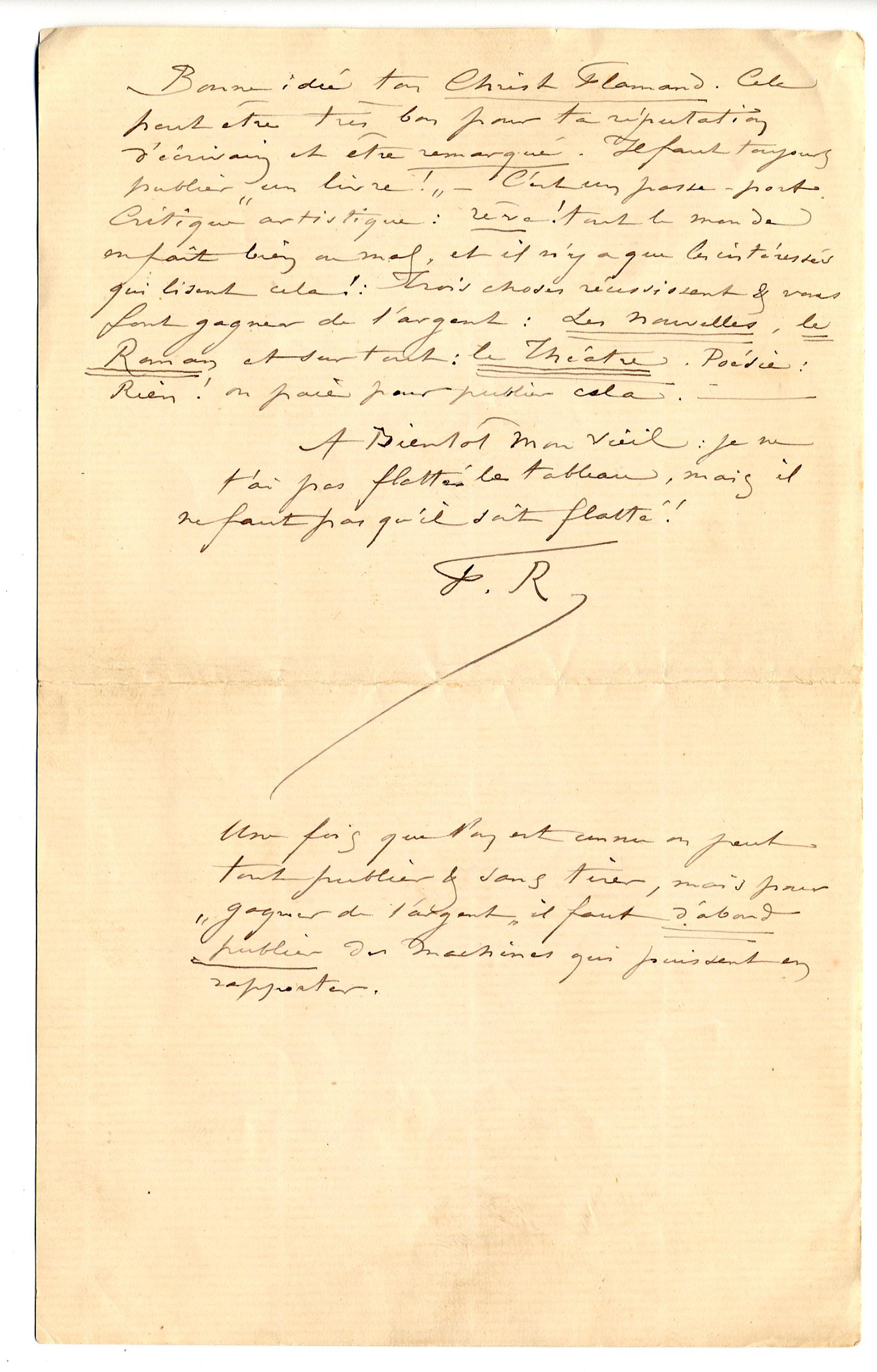 Bonne idée ton Christ Flamand. Cela peut être très bon pour ta réputation d’écrivain et être remarqué. Il faut toujours publier « un livre ! » – C’est un passe-port. Critique artistique : rêve ! tout le monde en fait bien ou mal, et il n’y a que les intéressés qui lisent cela ! : Trois choses réussissent & vous font gagner de l’argent : Les Nouvelles, le Roman et surtout : le Théatre. Poésie : Rien ! on paie pour publier cela. –