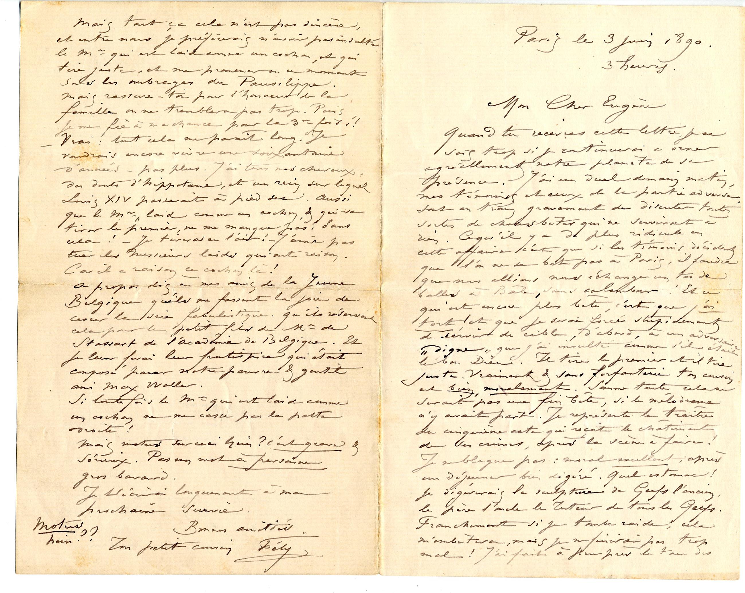 Quand tu recevras cette lettre, je ne sais trop si je continuerai a orner agréablement notre planète de sa présence. J’ai un duel demain matin, mes témoins et ceux de la partie adverse, sont en train gravement de discuter toutes sortes de choses bêtes qui ne serviront à rien. Ce qu’il y a de plus ridicule en cette affaire c’est que si les témoins décident que l’on ne se bat pas à Paris, il faudra que nous allions nous échanger un tas de balles à Bâle, sans calembour ! Et ce qui est encore plus bête, c’est que j’ai tort ! et que je serai forcé stupidement de servir de cible, d’abord, à un adversaire « digne » que j’ai insulté comme s’il était le bon Dieu. Il tire le premier et il tire juste. Vraiment & sans forfanterie ton cousin est bien, moralement. Somme toute cela ne serait pas une fin bête, si le mélodrame n’y avait part. Je représente le traître du cinquième acte qui reçoit le châtiment de ses crimes, après la scène à faire ! Je ne blague pas : moral excellent, après un déjeuner bien digéré. Quel estomac ! Je digérerais la sculpture de Geefs l’ancien, le père l’oncle le Tuteur de tous les Geefs. Franchement si je tombe raide, cela m’embètera, mais je ne finirai pas trop mal ! J’ai fait à peu près le tour des
