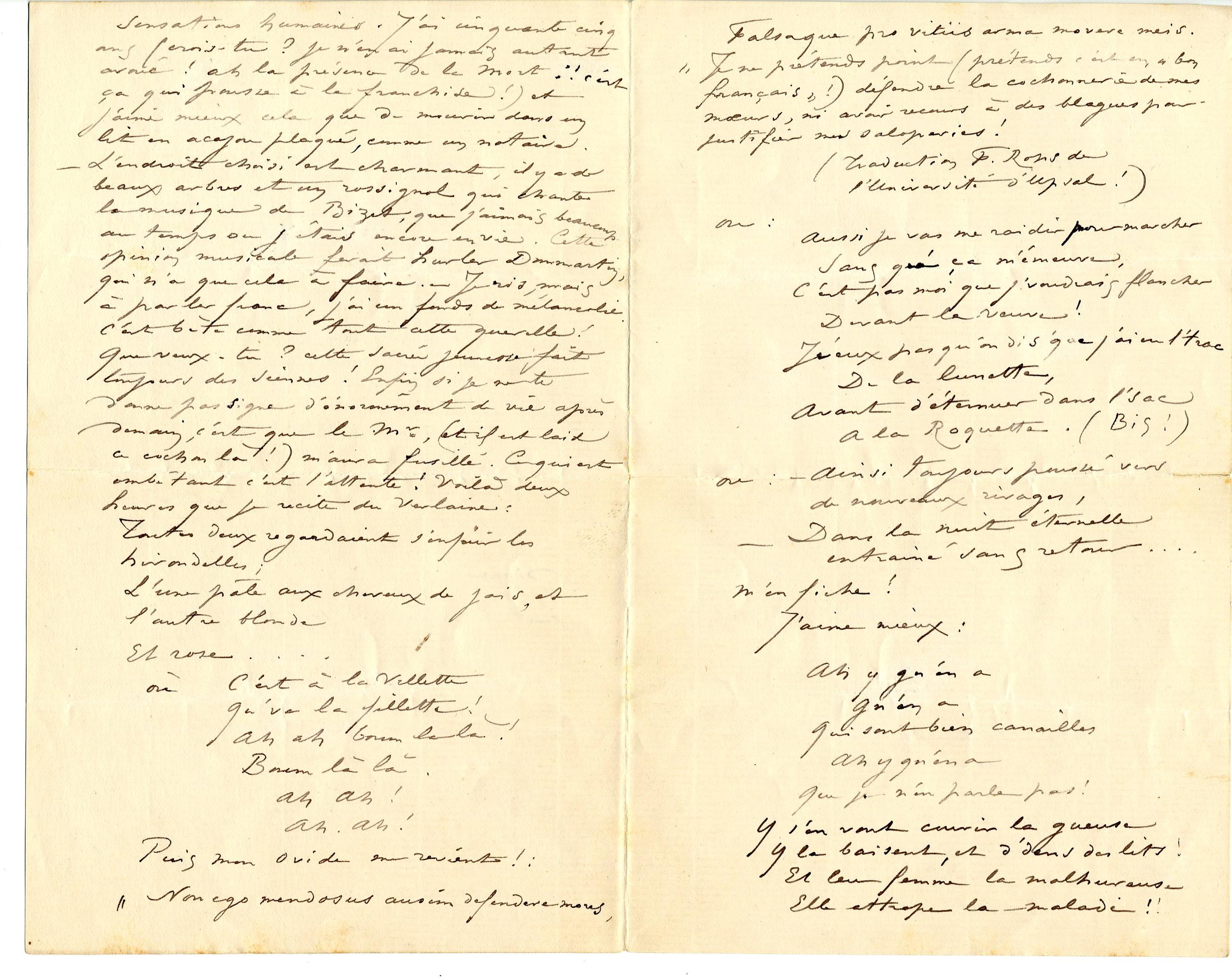 – L’endroit choisi est charmant, il y a de beaux arbres et un rossignol qui chante la musique de Bizet, que j’aimais beaucoup au temps où j’étais encore en vie. Cette opinion musicale ferait hurler Dommartin, qui n’a que cela à faire. – Je ris, mais à parler franc, j’ai un fonds de mélancolie. C’est bête comme tout cette querelle ! Que veux-tu ? cette sacrée jeunesse fait toujours des siennes ! Enfin si je ne te donne pas signe d’énormément de vie après demain, c’est que le Mr, (et il est lait ce cochon là !) m’aura fusillé. Ce qui est embêtant c’est l’attente ! Voilà deux heures que je recite du Verlaine :