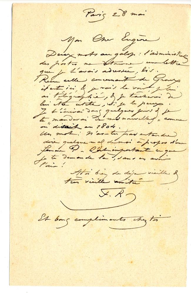 Reçu celle concernant de Groux il est ici, & je vais le voir, je lui ai télégraphié, & je tâcherai de lui être utile, si je le peux.