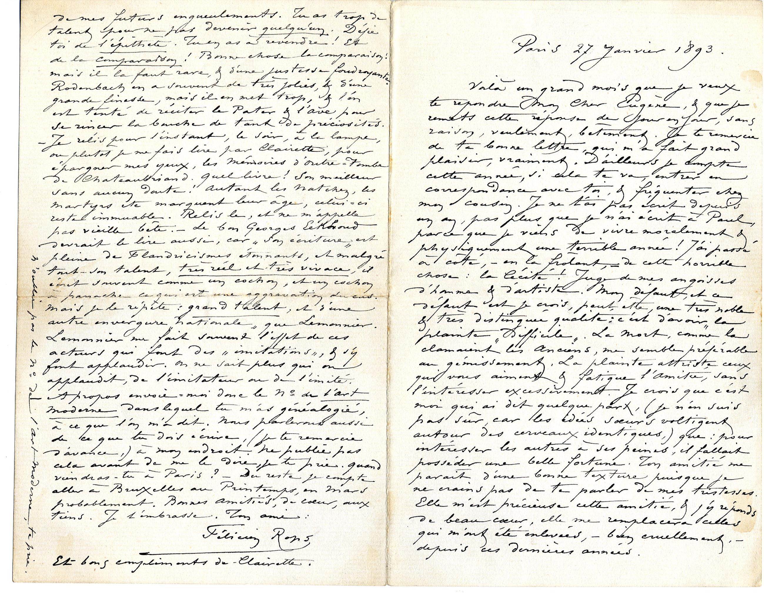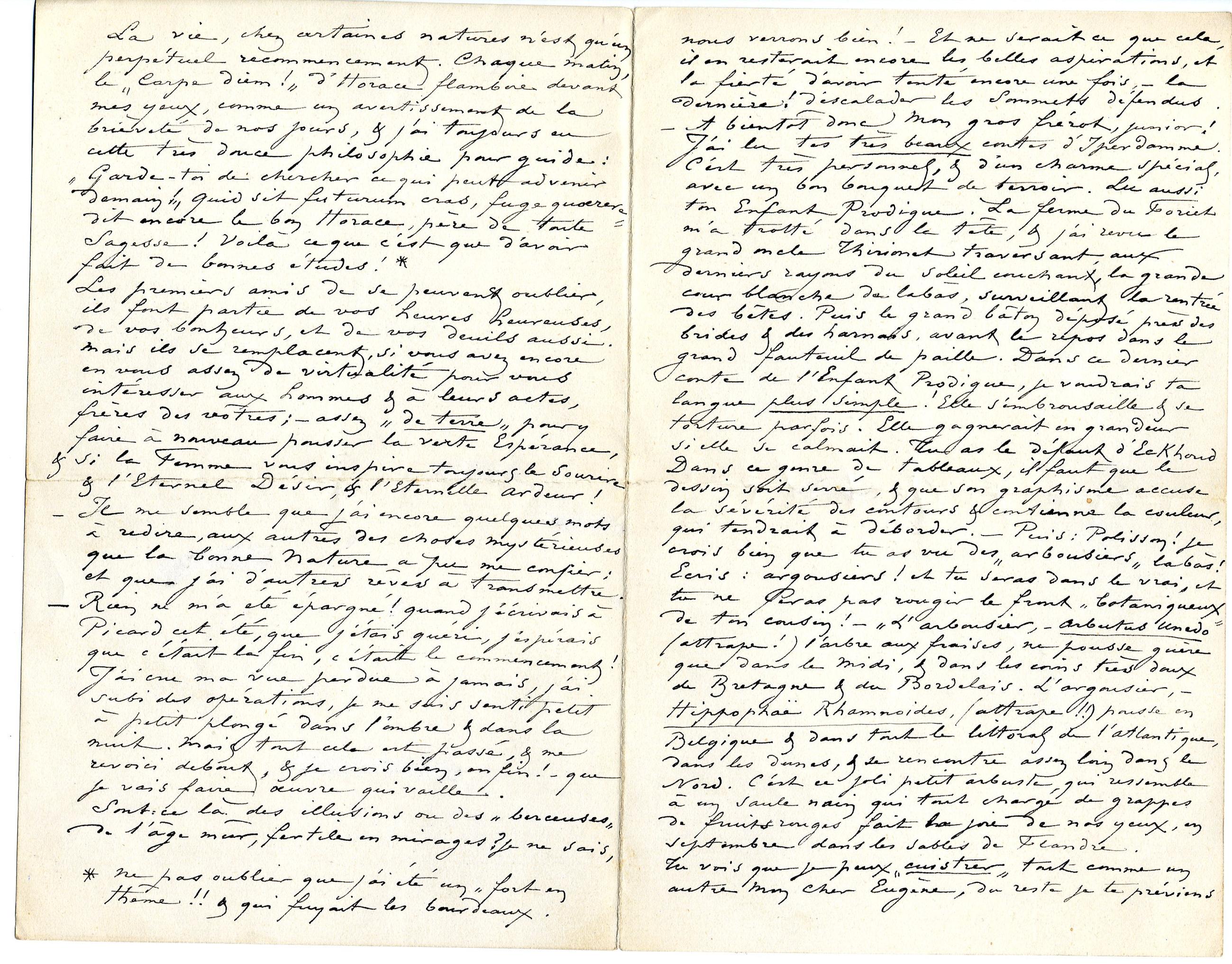 Voilà un grand mois que je veux te répondre Mon Cher Eugène, & que je remets cette réponse de jour en jour, sans raison, veulement, bêtement. Je te remercie de ta bonne lettre, qui m’a fait grand plaisir, vraiment. D’ailleurs je compte cette année, si cela te va, entrer en correspondance avec toi, & fréquenter chez mon cousin. Je ne t’ai pas écrit depuis un an, pas plus que je n’ai écrit à Paul, parce que je viens de vivre moralement & physiquement une terrible année ! J’ai passé à côté, – en la frôlant, – de cette horrible chose : la Cécité ! Juge de mes angoisses d’homme & d’artiste. Mon défaut, et ce défaut est je crois, peut être, une très noble & très distinguée qualité : c’est d’avoir la plainte « difficile ». La mort, comme la clamaient les Anciens, me semble préférable au gémissement. La plainte attriste ceux qui vous aiment & fatigue l’Amitié, sans l’intéresser excessivement. Je crois que c’est moi qui ai dit quelque part, (je n’en suis pas sûr, car les idées sœurs voltigent autour des cerveaux identiques,) que : pour intéresser les autres à ses peines, il fallait posséder une belle fortune. Ton amitié me paraît d’une bonne texture puisque je ne crains pas de te parler de mes tristesses. Elle m’est précieuse cette amitié, & j’y réponds de beau cœur, elle me remplacera celles qui m’ont été enlevées, – bien cruellement, – depuis ces dernières années.