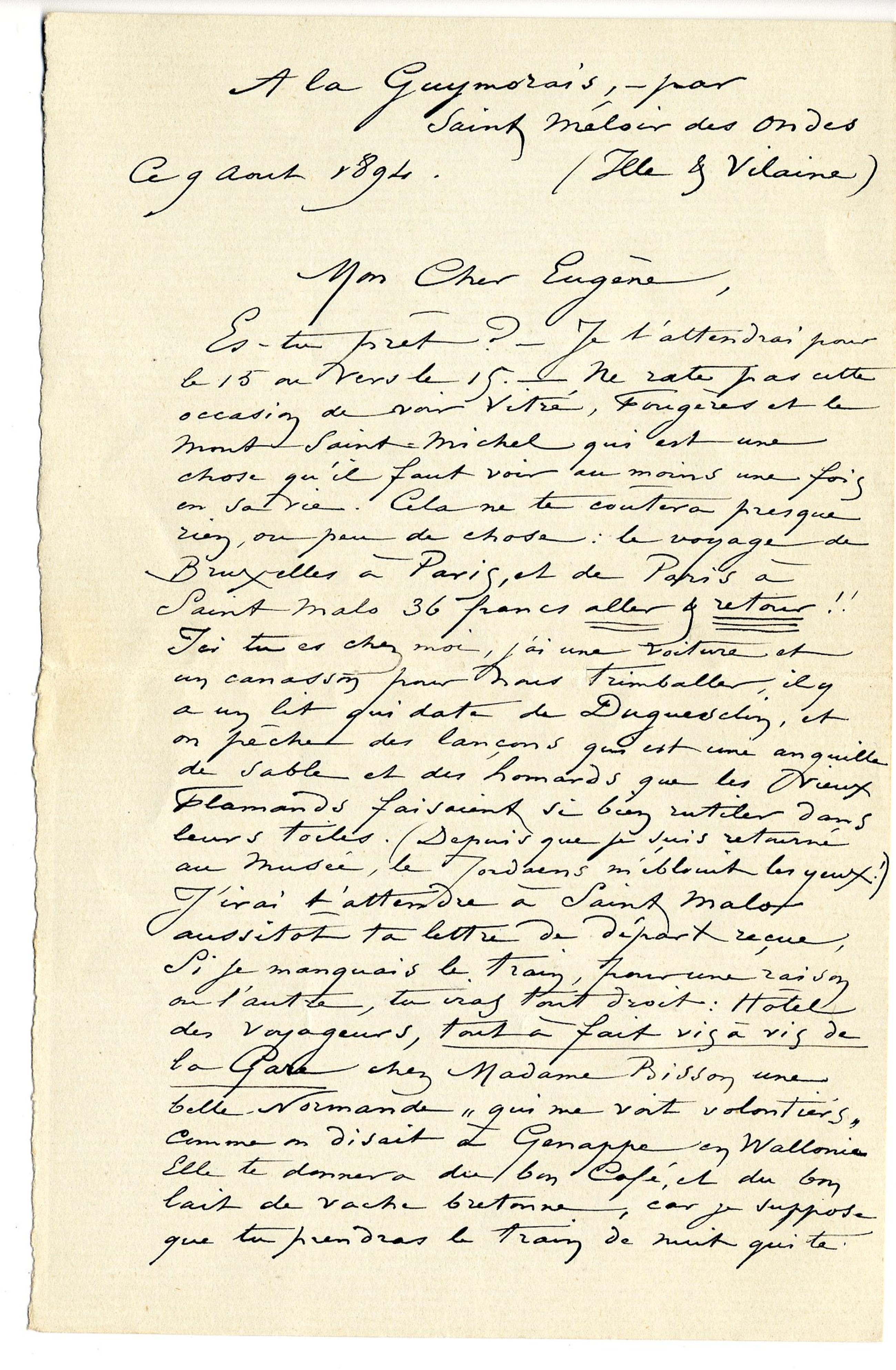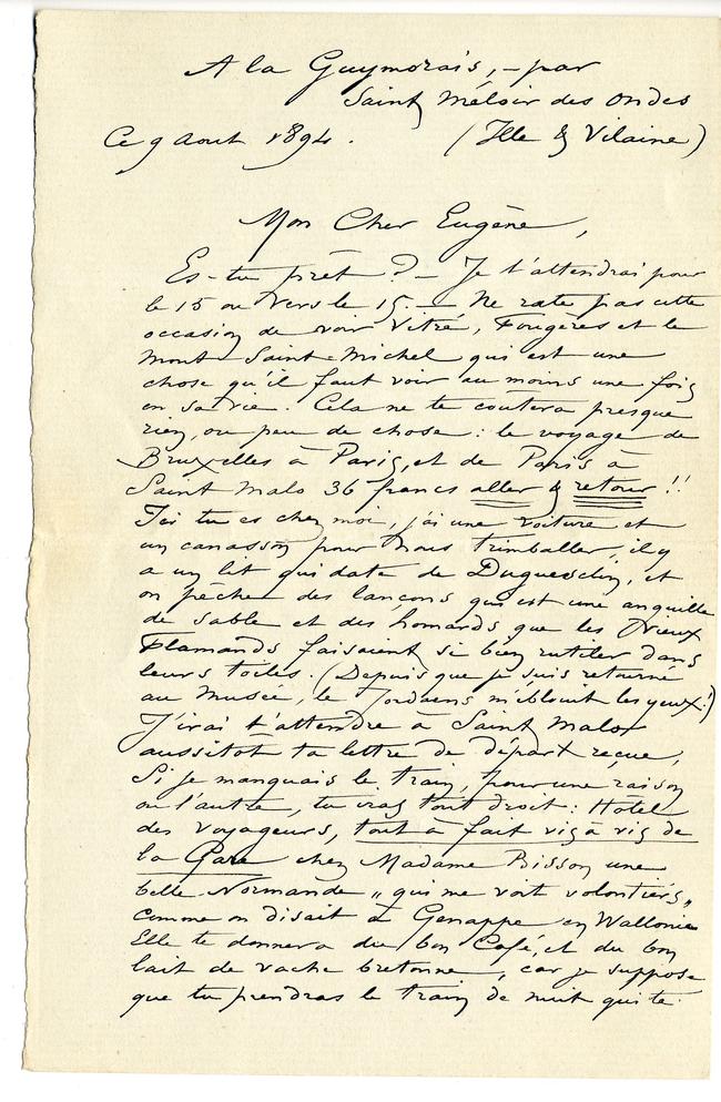 Es-tu prêt ? – Je t’attendrai pour le 15 ou vers le 15 . – Ne rate pas cette occasion de voir Vitré, Fougères et le Mont Saint-Michel qui est une chose qu’il faut voir au moins une fois en sa vie. Cela ne te coûtera presque rien, ou peu de chose : le voyage de Bruxelles à Paris, et de Paris à Saint Malo 36 francs aller & retour !! Ici tu es chez moi, j’ai une voiture et un canasson pour nous trimballer, il y a un lit qui date de Duguesclin, et on pêche des lançons qui est une anguille de sable et des homards que les vieux Flamands faisaient si bien rutiler dans leurs toiles. (Depuis que je suis retourné au Musée, le Jordaens m’éblouit les yeux !) J’irai t’attendre à Saint Malo aussitôt ta lettre de départ reçue,