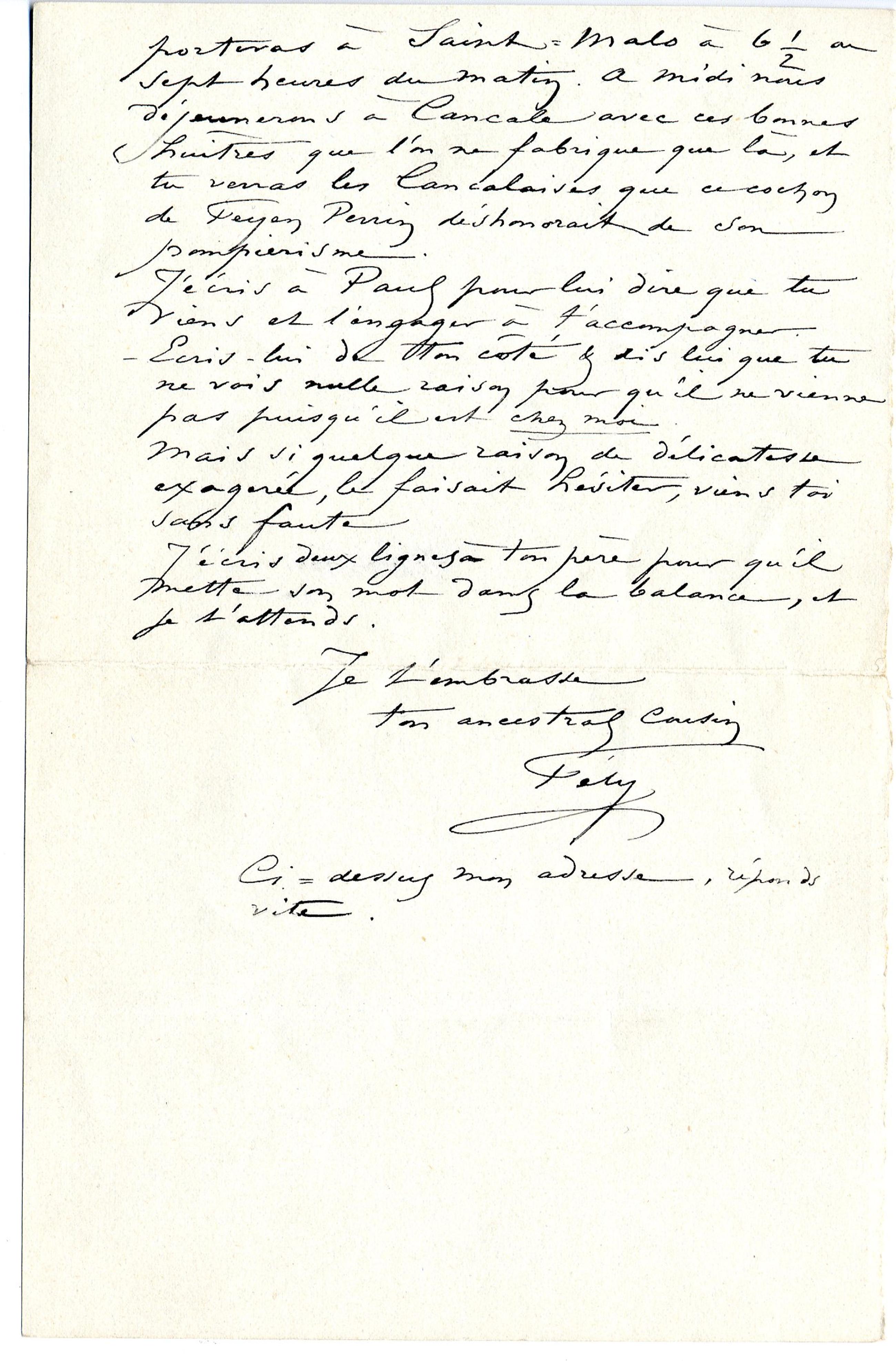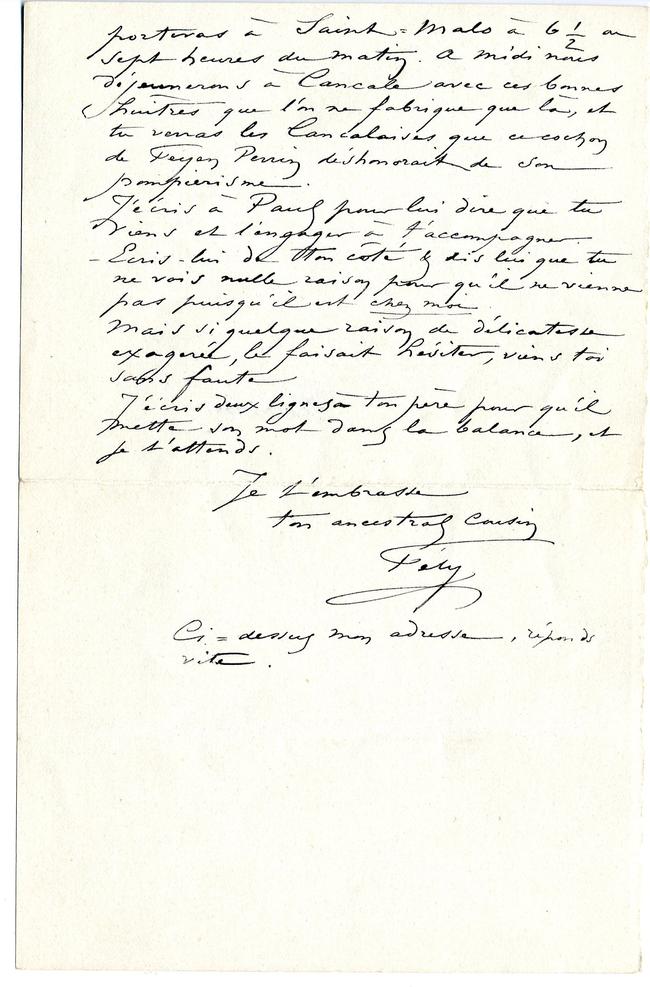 porteras à Saint-Malo à 6 ½ ou sept heures du matin. À midi nous déjeunerons à Cancale avec ces bonnes huîtres que l’on ne fabrique que là, et tu verras les Cancalaises que ce cochon de Feyen Perrin déshonorait de son pompierisme.