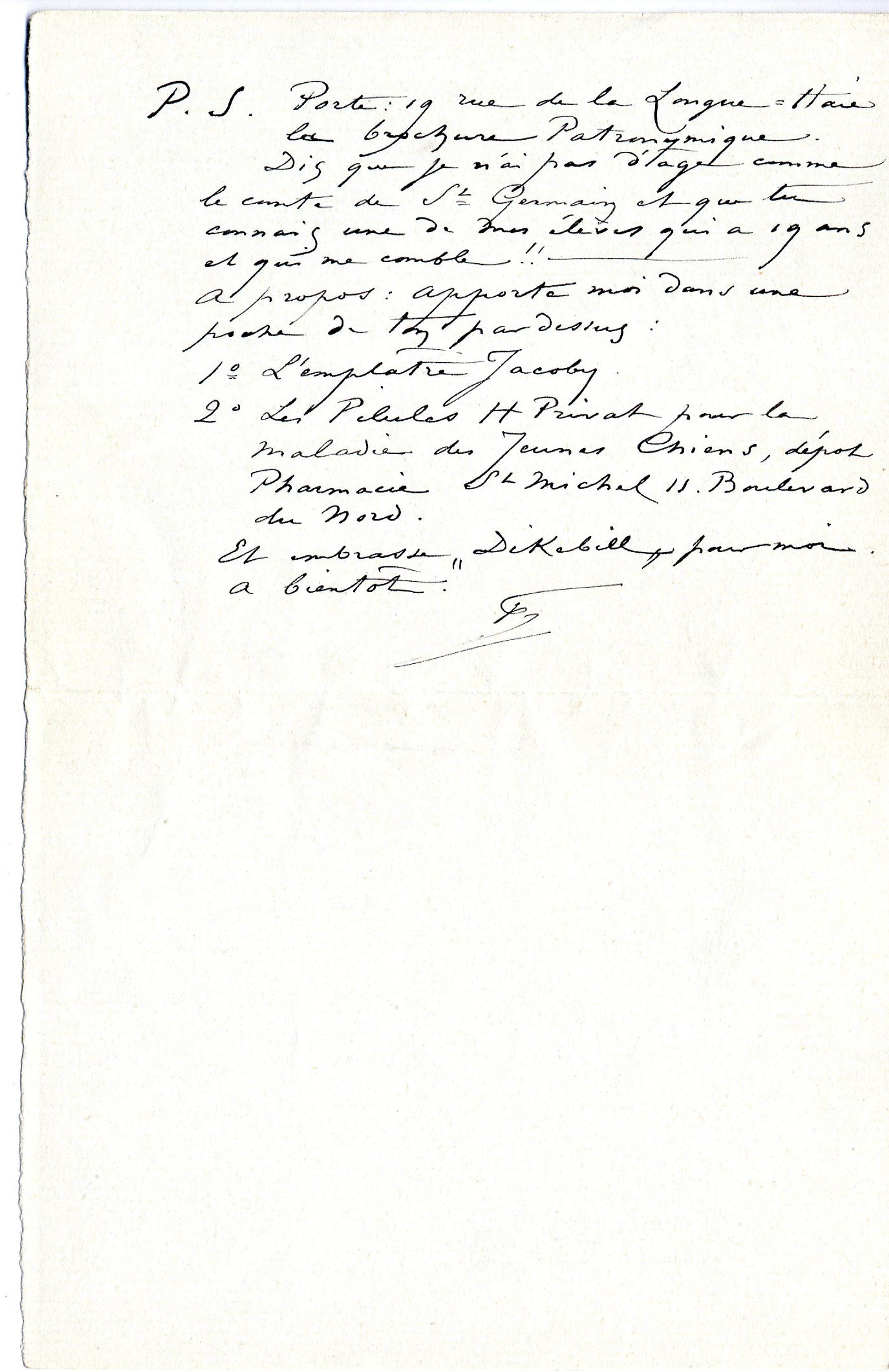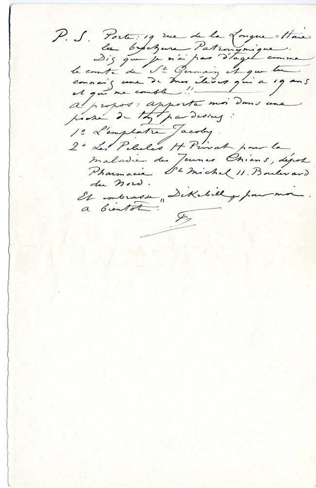 P.S. Porte : 19 rue de la Longue-Haie la brochure Patronymique. Dis que je n’ai pas d’âge comme le comte de St Germain et que tu connais une de mes élèves qui a 19 ans et qui me comble !! –