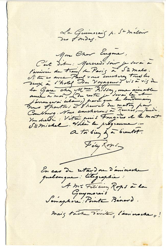 C’est dit : Mercredi soir je serai à l’arrivée du train de Paris à St Malo. Si tu es avec Paul vous coucherez tous les deux à l’hotel des Voyageurs vis à vis de la Gare chez MmeBisson, une aimable amie à moi, – (du reste je serai là et j’arrangerai cela,) parce que le lendemain nous partons à 8 heures du matin pour Combourg. Nous coucherons à Rennes, – Jeudi. Vendredi : Vitré puis Fougères et le Mont St Michel. Voilà le programme. –