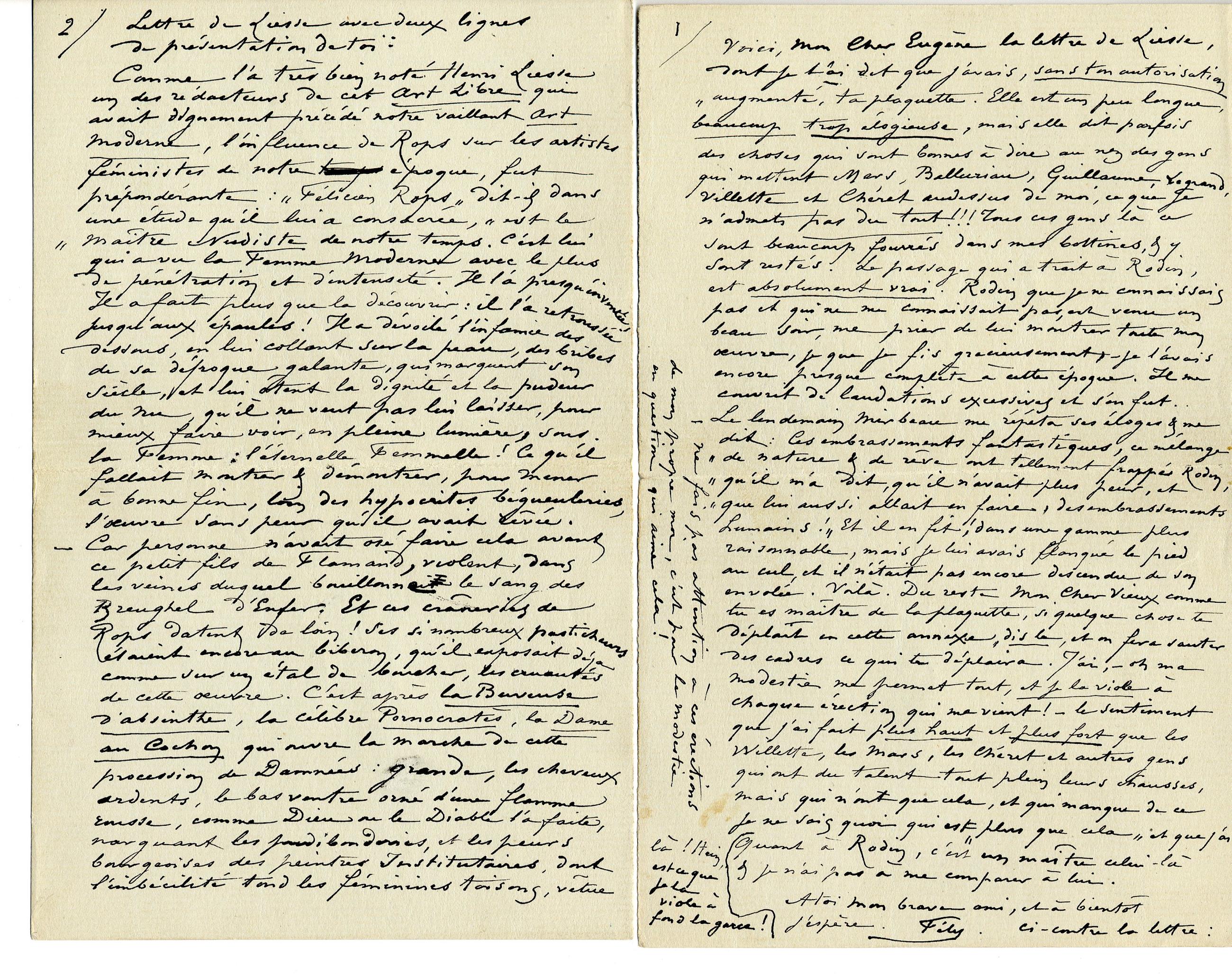 Voici, Mon Cher Eugène la lettre de Liesse, dont je t’ai dit que j’avais, sans ton autorisation « augmenté, ta plaquette. Elle est un peu longue, beaucoup trop élogieuse, mais elle dit parfois des choses qui sont bonnes à dire au nez des gens qui mettent Mars, Balluriau, Guillaume, Legrand, Villette et Chéret audessus de moi, ce que je n’admets pas du tout!!! Tous ces gens là ce sont beaucoup fourrés dans mes bottines, & y sont restés. Le passage qui a trait à Rodin, est absolument vrai. Rodin que je ne connaissais pas et qui ne me connaissait pas, est venu un beau soir, me prier de lui montrer toute mon œuvre, ce que je fis gracieusement, – je l’avais encore presque complète à cette époque. Il me couvrit de laudations excessives et s’en fut.