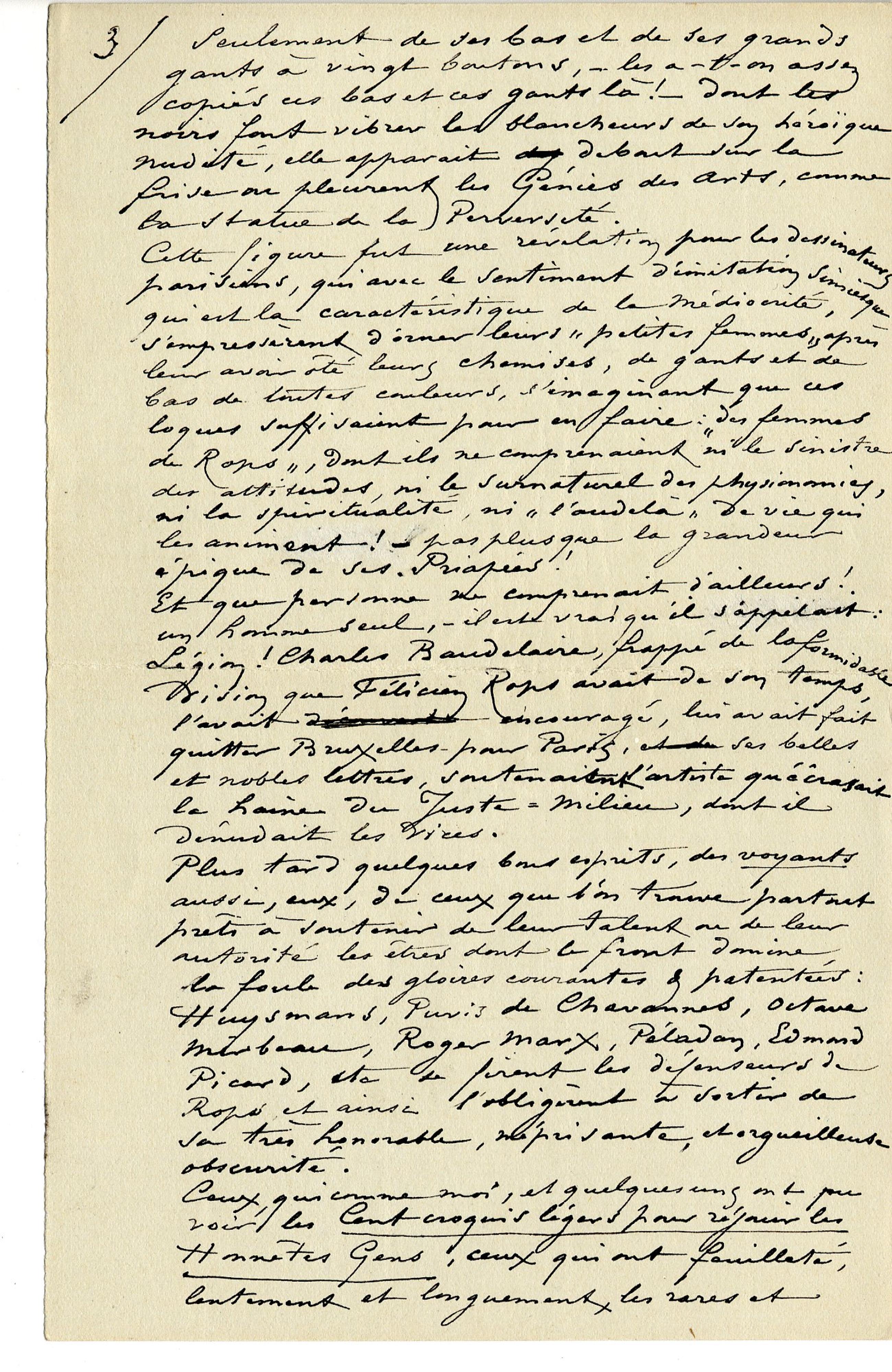 Plus tard quelques bons esprits, des voyants aussi, eux, de ceux que l’on trouve partout prêts à soutenir de leur talent ou de leur autorité les êtres dont le front domine la foule des gloires courantes & patentées : Huysmans, Puvis de Chavannes, Octave Mirbeau, Roger Marx, Péladan, Edmond Picard, etc se firent les défenseurs de Rops et ainsi l’obligèrent à sortir de sa très honorable, méprisante, et orgueilleuse obscurité.