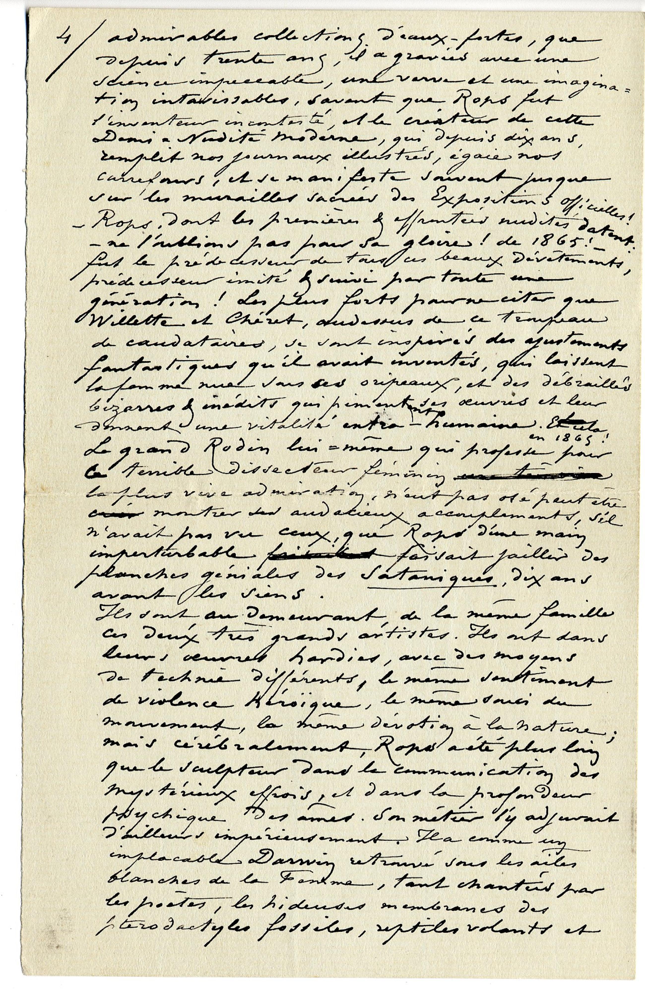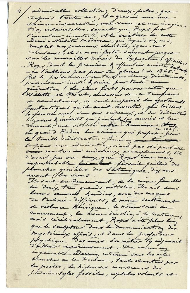 Le grand Rodin lui-même qui professe pour ce terrible dissecteur féminin un témoign la plus vive admiration, n’eut pas osé peut être croir montrer ses audacieux accouplements, s’il n’avait pas vu ceux, que Rops d’une main imperturbable faisaient faisait jaillir des planches géniales des Sataniques, dix ans avant les siens.