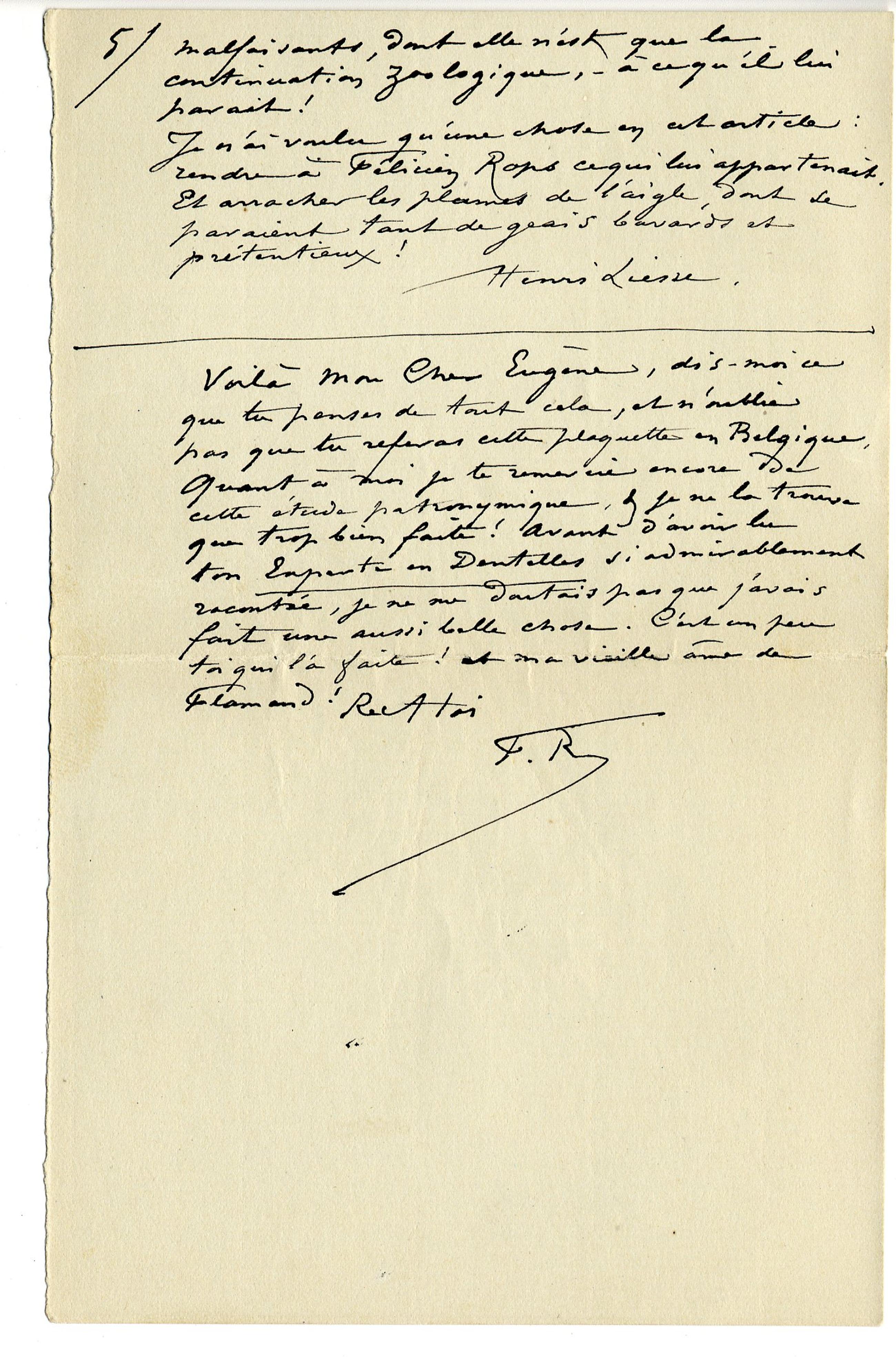 Voilà Mon Cher Eugène, dis-moi ce que tu penses de tout cela, et n’oublie pas que tu referas cette plaquette en Belgique. Quant à moi je te remercie encore de cette étude patronymique, & je ne la trouve que trop bien faite ! Avant d’avoir lu ton Experte en Dentelles si admirablement racontée, je ne me doutais pas que j’avais fait une aussi belle chose. C’est un peu toi qui l’a faite ! et ma vieille âme de Flamand !