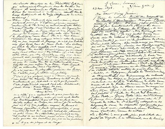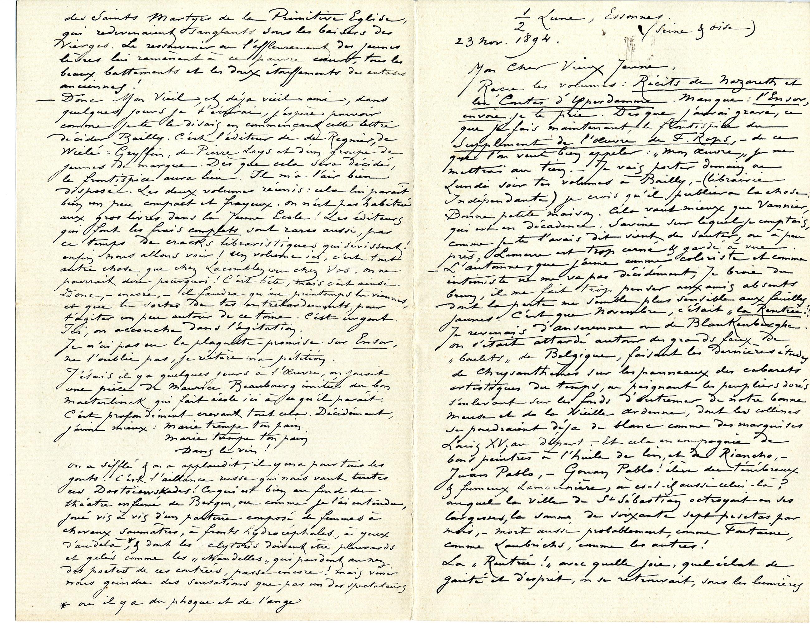– Donc Mon Vieil, et déja vieil ami, dans quelques jours je t’écrirai, j’espère pouvoir comme je te le disais en commençant cette lettre décider Bailly. C’est l’éditeur de de Regnier, de Wielé-Gryffin, de Pierre Loys et d’un groupe de jeunes de marque. Dès que cela sera décidé, le frontispice aura lieu. Il m’a l’air bien disposé. Les deux volumes réunis : cela lui paraît bien un peu compact et frayeux. On n’est pas habitué aux gros livres dans la jeune École ! Les éditeurs qui font les frais complets sont rares aussi, par ce temps de cracks