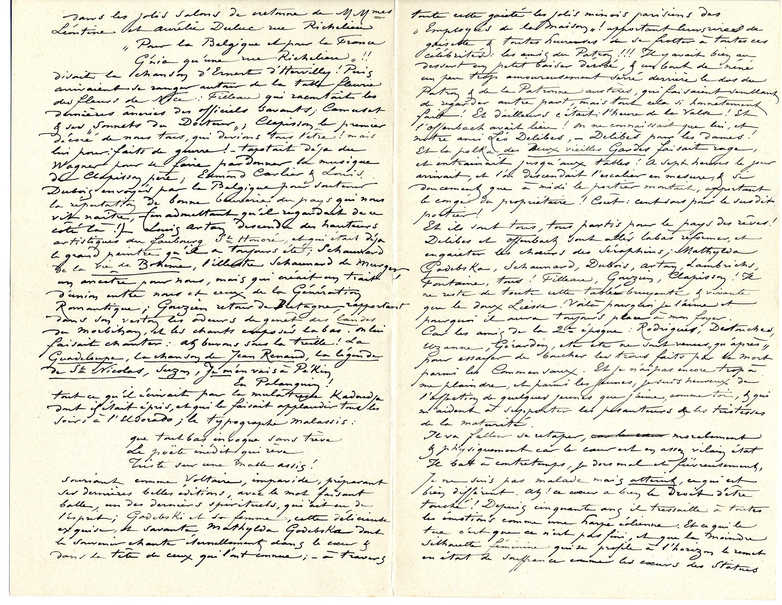 Et ils sont tous, tous partis pour le pays des rêves ! Delibes et Offenbach sont allés labàs réformer, et engaieter les chœurs des Séraphins ; Mathylda Godebska, Schaunard, Dubois, Artan, Lambrichs, Fontaine, tous ! Filleau, Gouzien, Clapisson ! Il ne reste de toute cette tablée bruyante & vivante que le doux Liesse ! Voilà pourquoi je l’aime et pourquoi il aura toujours place à mon foyer. Car les amis de la 2e époque : Rodrigues, Destouches, Uzanne, Gérardin, etc etc ne sont venus « qu’après » pour essayer de boucher les trous faits par la mort parmi les Commensaux. Et je n’ai pas encore trop à me plaindre, et parmi les jeunes, je suis heureux de l’affection de quelques jeunes que j’aime, comme toi, & qui m’aident à supporter les pesanteurs & les tristesses de la maturité.