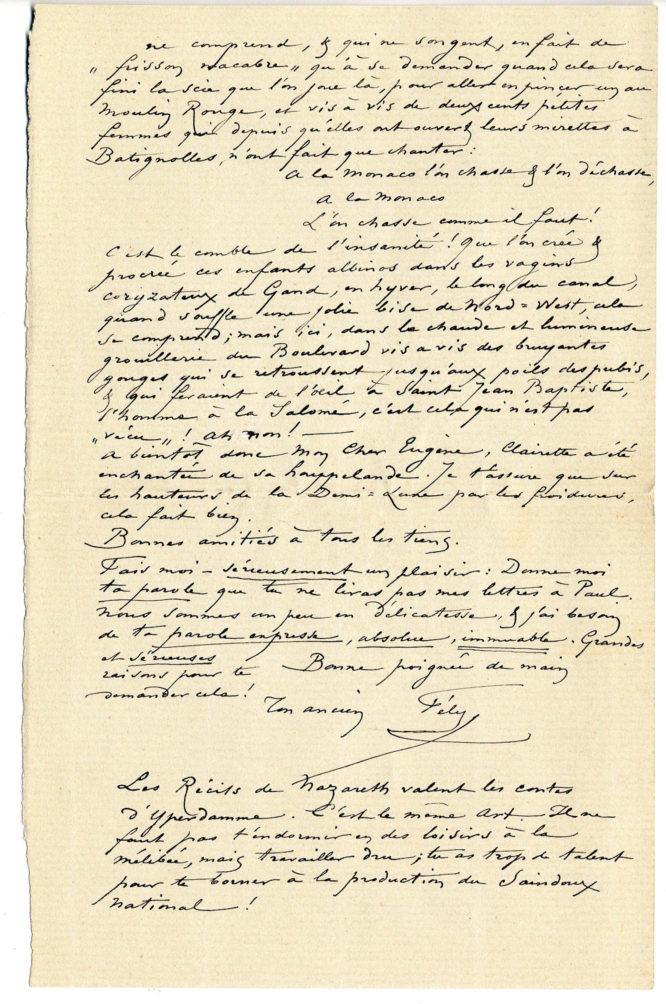 Fais moi – sérieusement un plaisir : Donne moi ta parole que tu ne liras pas mes lettres à Paul. Nous sommes un peu en délicatesse, & j’ai besoin de ta parole expresse, absolue, immuable. Grandes et sérieuses raisons pour te demander cela !