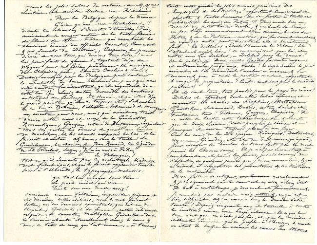– L’Automne, que j’aime comme coloriste et comme intimiste ne me va pas décidément, Je broie du brun, il me fait trop penser aux amis absents dont la perte me semble plus sensible aux feuilles jaunes. C’est que Novembre, c’était « la Rentrée !! Je revenais d’Anseremme ou de Blankenberghe. On s’était attardé autour des grands feux de « boulets » de Belgique, faisant les dernières études de Chrysanthèmes sur les panneaux des cabarets artistiques du temps, ou peignant les peupliers dorés s’enlevant sur les fonds d’outremer de notre bonne Meuse et de la Vieille Ardenne, dont les collines se poudraient déja de blanc comme des marquises Louis XV ; au départ. Et cela en compagnie de bons peintres à l’huile de lin, et de Riancho, – Juan Pablo, – Gouan Pablo ! élève du ténébreux & fumeux Lamorinière, où es-t-il aussi celui-là ? auquel la ville de St Sébastian octroyait en ses largesses, la somme de soixante sept pesetas par mois, – mort aussi probablement, comme Fontaine, comme Lambrichs, comme les autres !