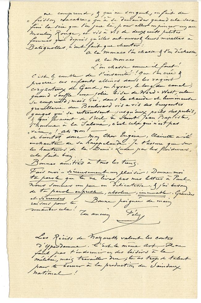 Reçu les volumes : Récits de Nazareth et les Contes d’Yperdamme. Manque : l’Ensor, envoie, je te prie. Dès que j’aurai gravé, ce que je fais maintenant, le frontispice du Supplément de l’œuvre de F. Rops, – de ce que l’on veut bien appeler : « mon œuvre » je me mettrai au tien. – Je vais porter demain ou Lundi soir tes volumes à Bailly, – (librairie Indépendante) je crois qu’il publiera la chose. Bonne petite maison. Cela vaut mieux que Vannier, qui est en décadence. Savine sur lequel je comptais, comme je te l’avais dit vient de sauter, ou à peu près, Lemerre est trop cerné & gardé à vue.