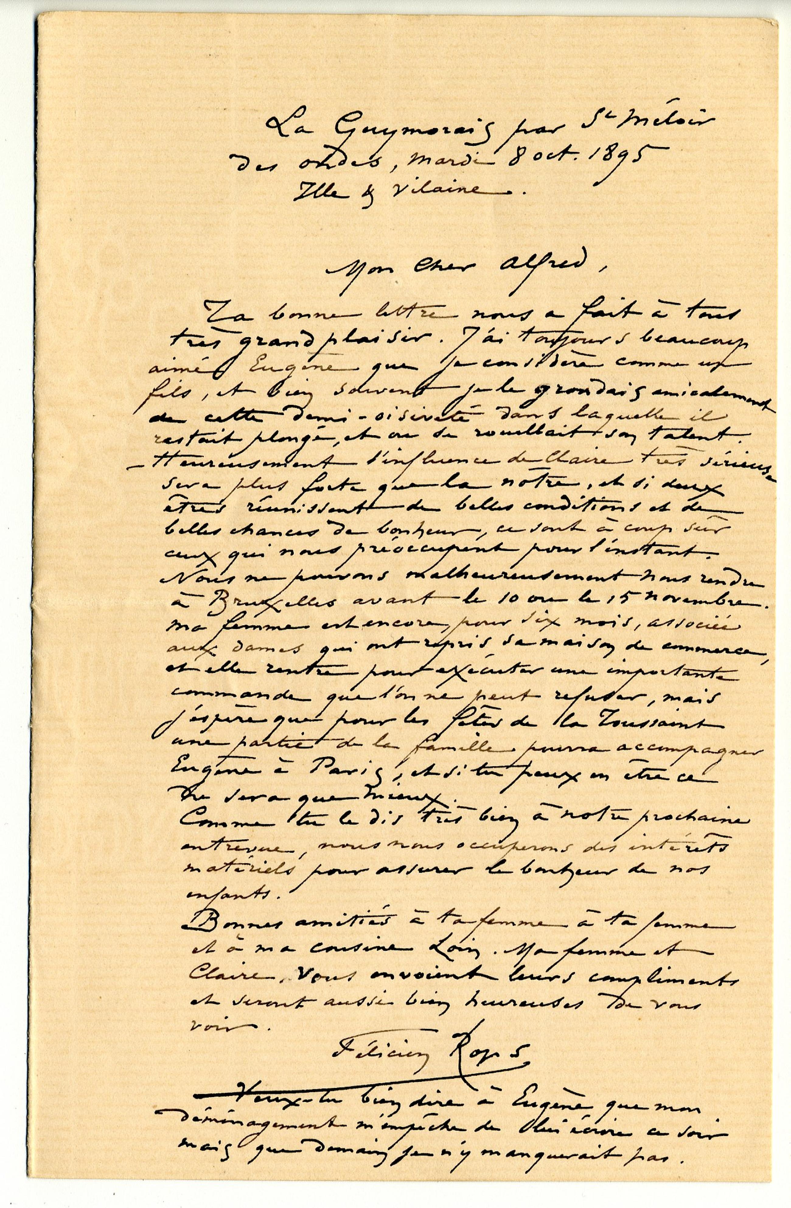 – Heureusement l’influence de Claire très sérieuse sera plus forte que la nôtre, et si deux êtres réunissent de belles conditions et de belles chances de bonheur, ce sont à coup sûr ceux qui nous préoccupent pour l’instant. Nous ne pouvons malheureusement nous rendre à Bruxelles avant le 10 ou le 15 novembre. Ma femme est encore, pour six mois, associée aux dames qui ont repris sa maison de commerce, et elle rentre pour exécuter une importante commande que l’on ne peut refuser, mais j’espère que pour les fêtes de la Toussaint une partie de la famille pourra accompagner Eugène à Paris, et si tu peux en être ce ne sera que mieux.