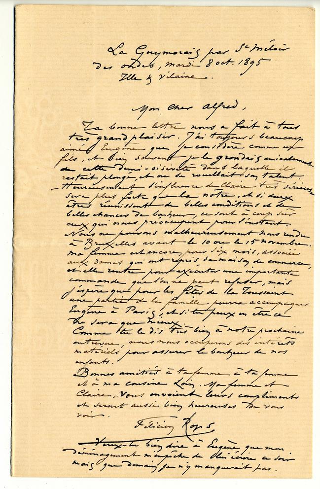 Ta bonne lettre nous a fait à tous très grand plaisir. J’ai toujours beaucoup aimé Eugène que je considère comme un fils, et bien souvent je le grondais amicalement de cette demi-oisiveté dans laquelle il restait plongé, et où se rouillait son talent.