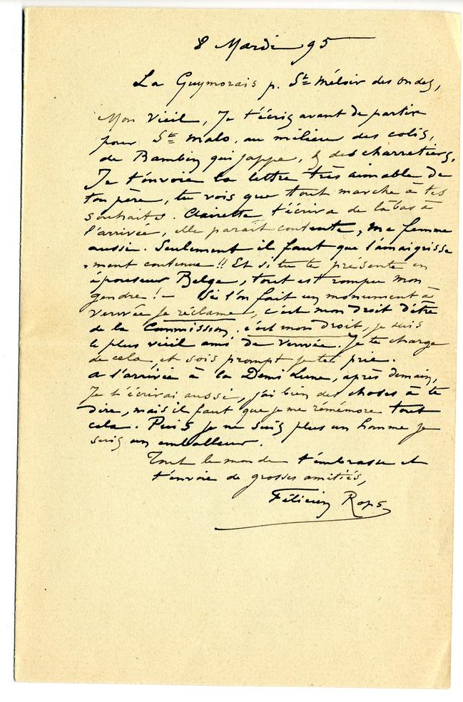 Je t’écris avant de partir pour St Malo, au milieu des colis, de Bambin qui jappe, & des charretiers. Je t’envoie la lettre très aimable de ton père, tu vois que tout marche à tes souhaits. Clairette t’écrira de làbas à l’arrivée, elle paraît contente, ma femme aussi. Seulement il faut que l’amaigrissement continue !! Et si tu te présente en épouseur Belge, tout est rompu mon gendre ! – Si l’on fait un monument à Verwée je réclame, c’est mon droit d’être de la Commission. c’est mon droit, je suis le plus vieil ami de Verwée. Je te charge de cela, et sois prompt je te prie.