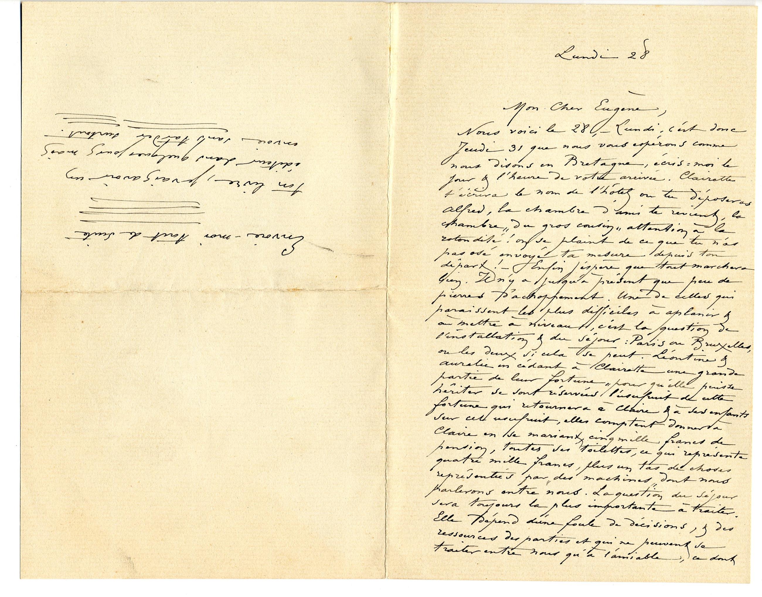 Nous voici le 28, – Lundi, c’est donc Jeudi 31 que nous vous espérons comme nous disons en Bretagne, écris-moi le Jour & l’heure de votre arrivée. Clairette t’écrira le nom de l’hôtel où tu déposeras Alfred, la chambre d’ami te revient, la chambre « du gros cousin » attention à la rotondité ! On se plaint de ce que tu n’as pas osé envoyé ta mesure depuis ton départ ! – Enfin j’espère que tout marchera bien. Il n’y a jusqu’à présent que peu de pierres d’achoppement. Une de celles qui paraissent les plus difficiles à aplanir & à mettre à niveau, c’est la question de l’installation & du séjour : Paris ou Bruxelles, ou les deux si cela se peut. Léontine & Aurelie Duluc en cédant à Clairette une grande partie de leur fortune « pour qu’elle puisse hériter se sont réservées l’usufruit de cette fortune qui retournera à Claire & à ses enfants sur cet usufruit, elles comptent donner à Claire en se mariant, cinq mille francs de pension, toutes ses toilettes, ce qui représente quatre mille francs, plus un tas de choses représentées par « des machines » dont nous parlerons entre nous. La question du séjour sera toujours la plus importante à traiter. Elle dépend d’une foule de décisions, & des ressources des parties et qui ne peuvent se traiter entre nous qu’à l’amiable, ce dont