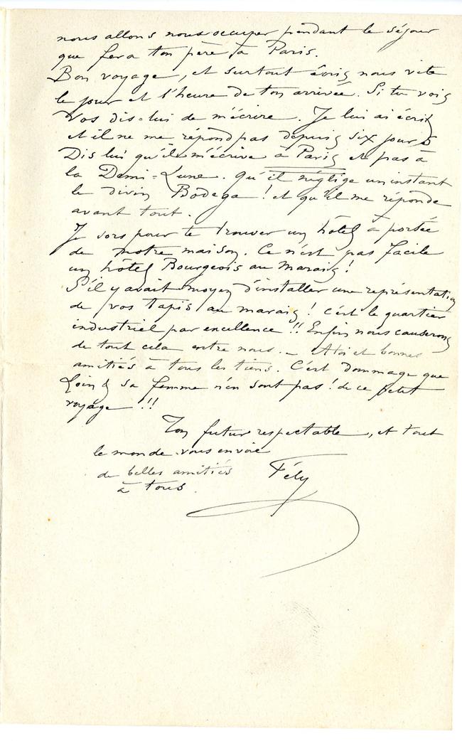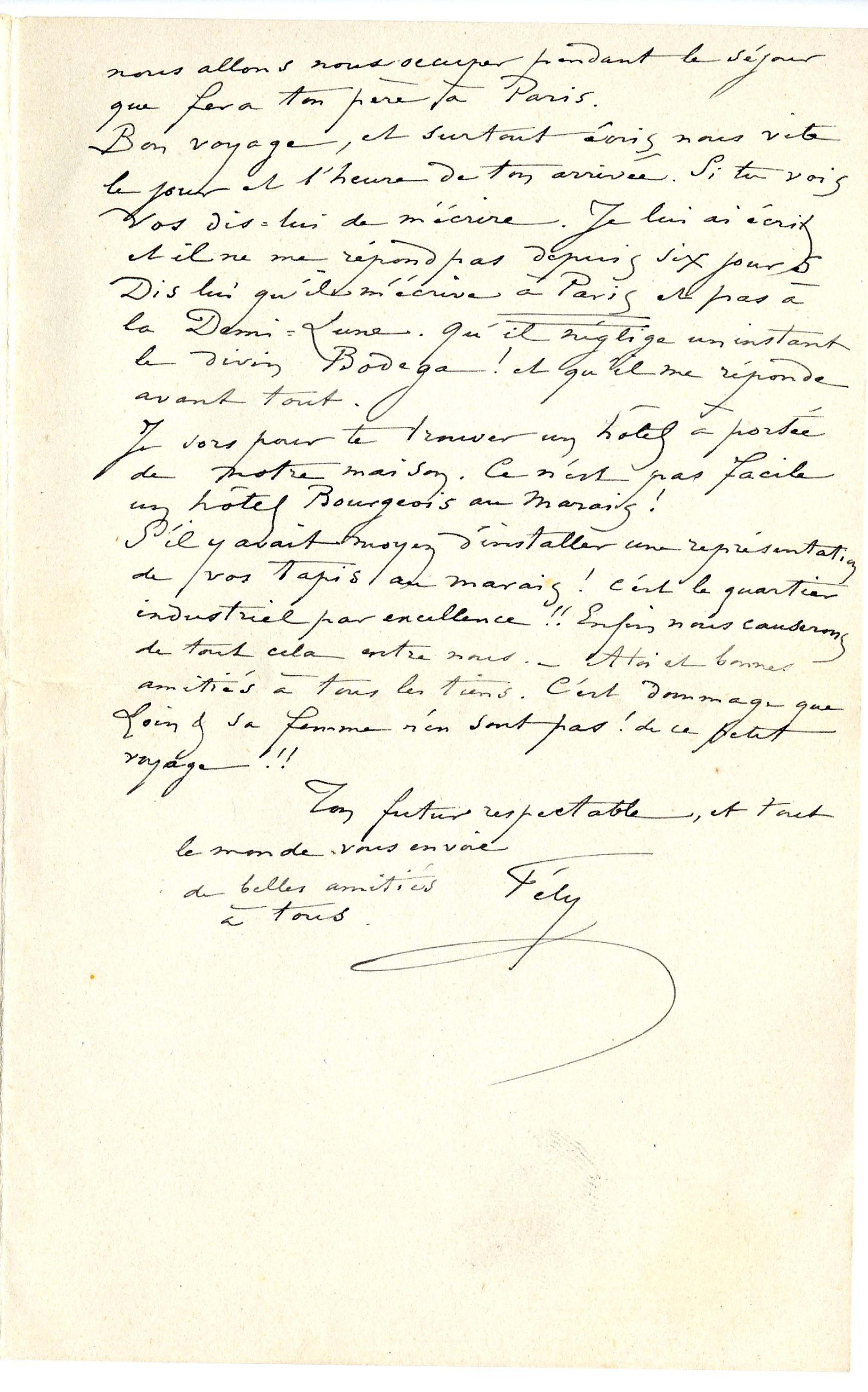 S’il y avait moyen d’installer une représentation de vos tapis au marais ! C’est le quartier industriel par excellence !! Enfin nous causerons de tout cela entre nous. – À toi et bonnes amitiés à tous les tiens. C’est dommage que Loin & sa femme n’en sont pas ! de ce petit voyage !!