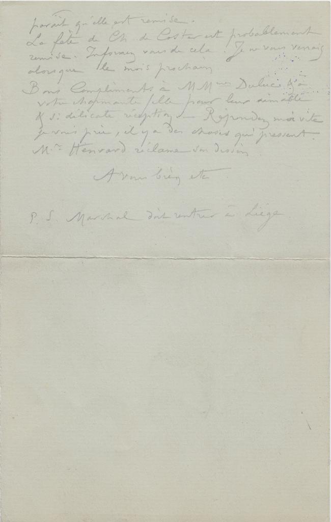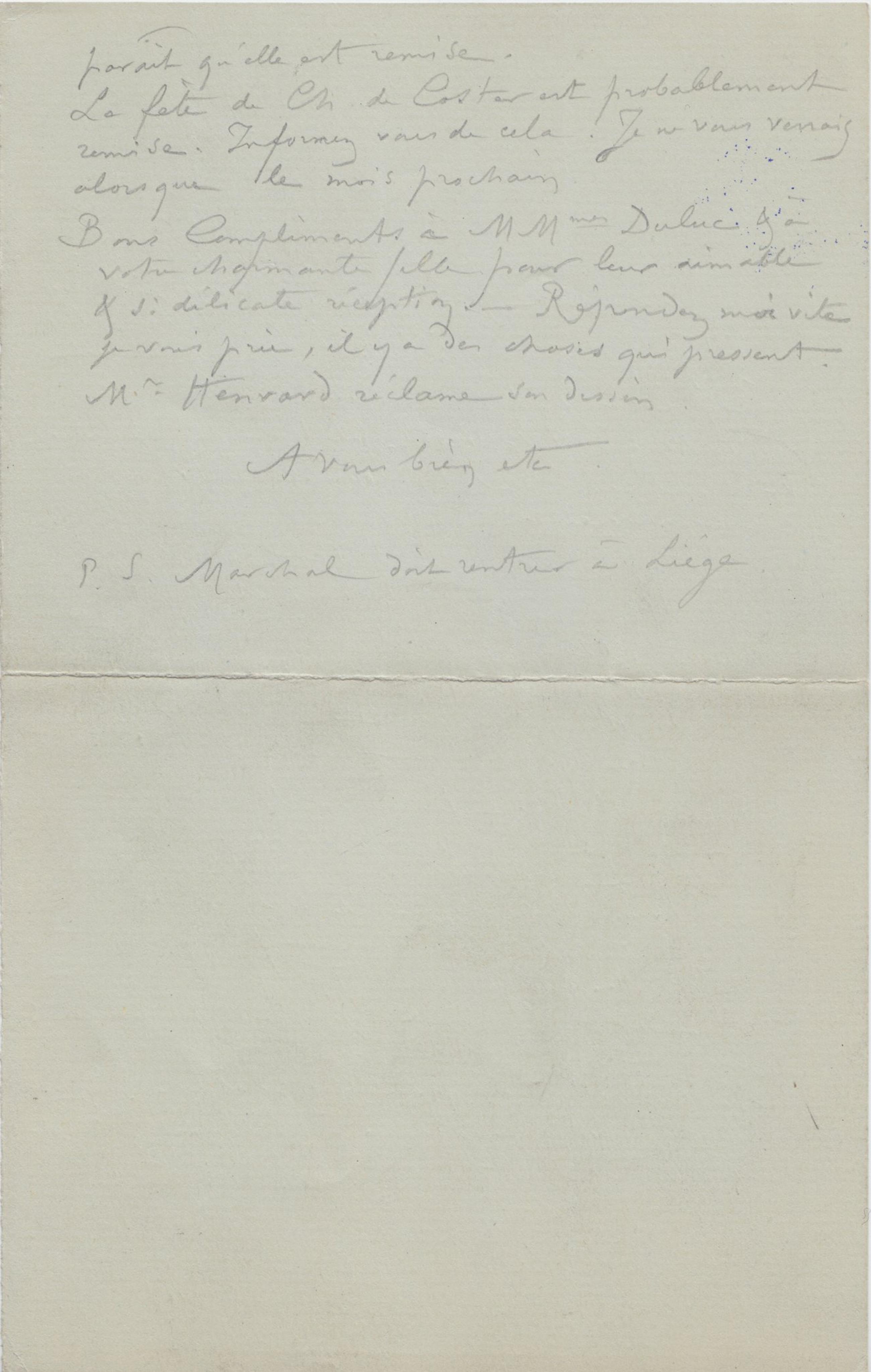 Bons Compliments à MMmes Duluc & à votre charmante fille pour leur aimable & si délicate réception. – Répondez moi vite je vous prie, il y a des choses qui pressent. Mr Henrard réclame son dessin.