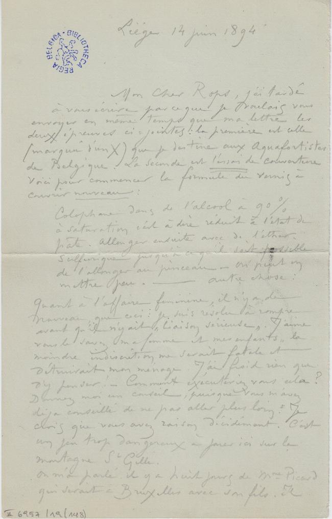 Mon Cher Rops, j’ai tardé à vous écrire par ce que je voulais vous envoyer en même temps que ma lettre les deux épreuves ci-jointes : la première est celle (marquée d’un X) que je destine aux Aquafortistes de Belgique. La seconde est l’essai de couverture Voici pour commencer la formule du vernis à couvrir nouveau :
